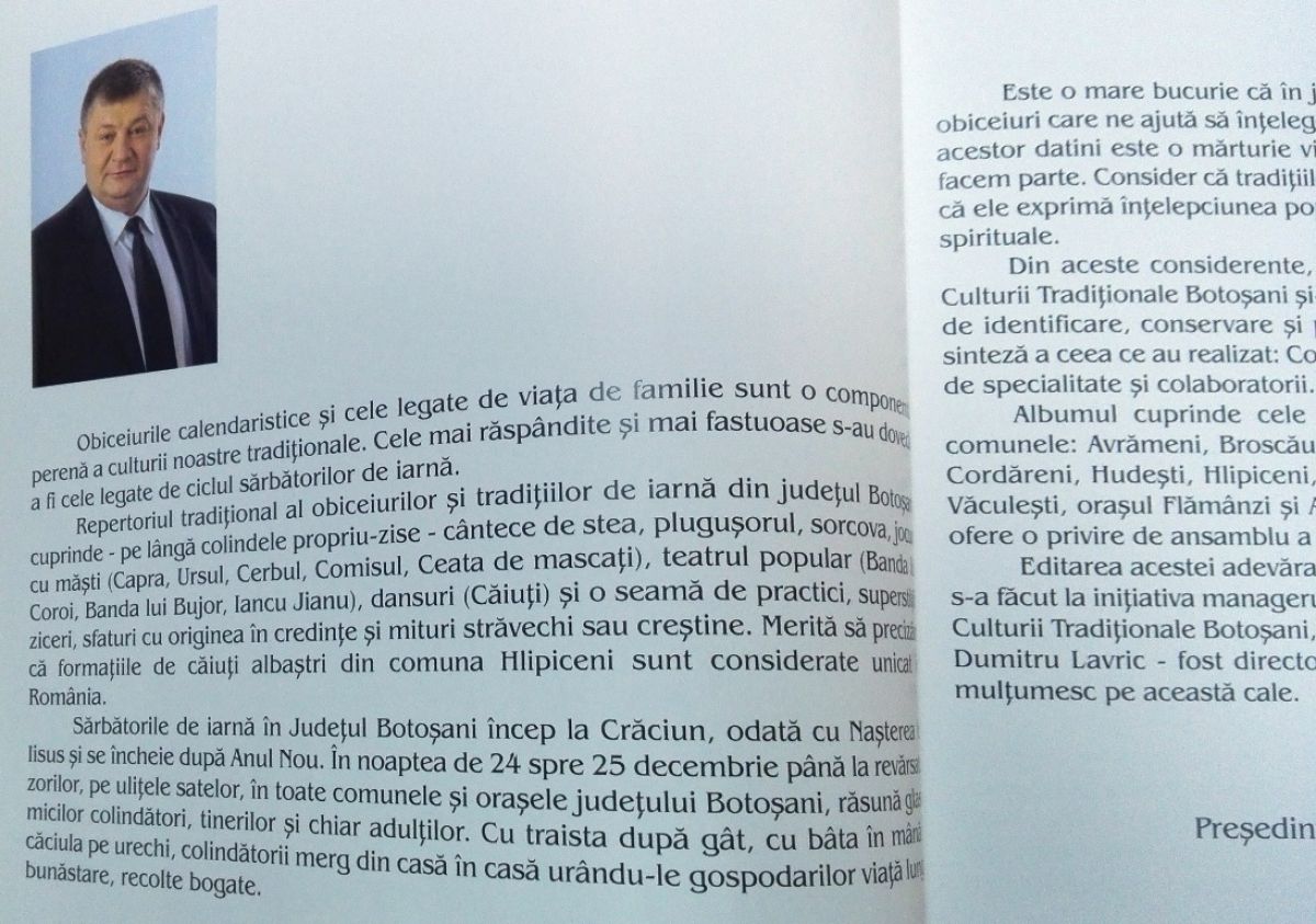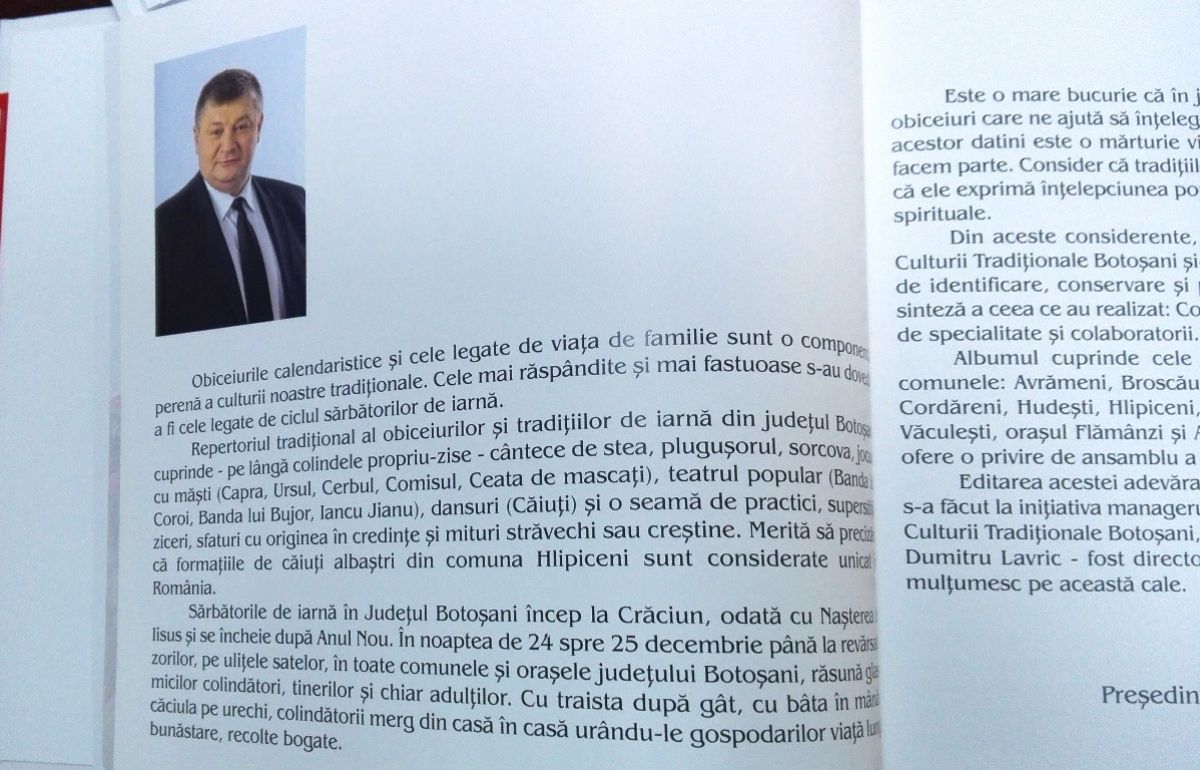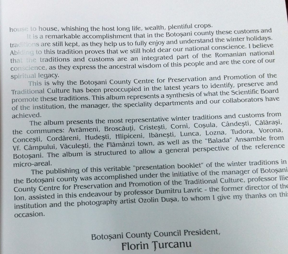 Știu că poate n-o să vă vină să credeți, dar acest text în limba engleză face parte dintr-un mesaj al fostului președinte al Consiliului Județean, Florin Țurcanu. El se regăsește pe albumul ”Botoșani, datini și obiceiuri de iarnă”, editat în urmă cu vreo patru ani de Centrul Județean pentru Conservarea și Promovarea Culturii Tradiționale (CJCPCT). Aflat chiar la începutul albumului, mesajul are atașată o poză asemeni mai tuturor cărților de pe vremea comuniștilor care începeau invariabil cu dictatorul Nicolae Ceaușescu. CJCPCT este o instituție subordonată Consiliului Județean Botoșani, iar la data la care s-au tipărit aceste albume Florin Țurcanu era președinte.