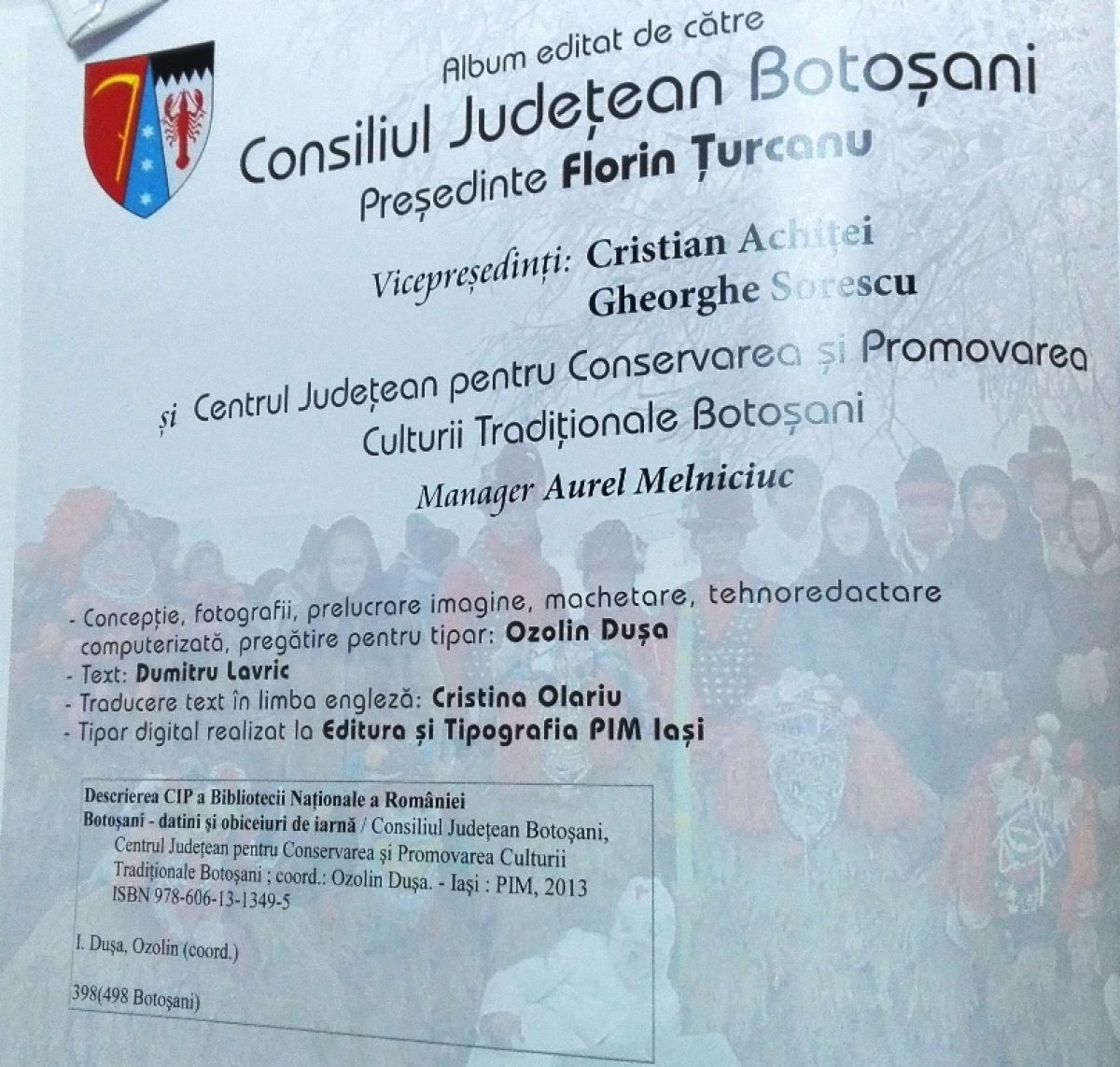 Tot în primele pagini se menționează – ”Album editat de către Consiliul Județean Botoșani”, imediat fiind trecute numele președintelui și vicepreședinților CJ. Abia apoi îi aflăm pe cei care s-au ocupat efectiv de scoaterea pe piață a albumului: