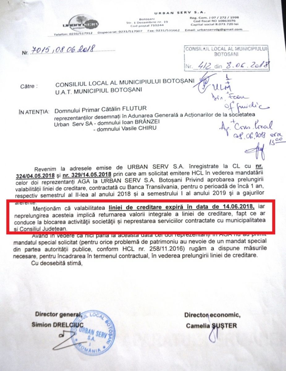 „Menţionăm că valabilitatea liniei de creditare expiră în data de 14 iunie 2018, iar neprelungirea acesteia implică returnarea valorii integrale a liniei de creditare, fapt ce ar conduce la blocarea activităţii societăţii şi nerespectarea serviciilor contractate cu municipalitatea şi Consiliul Judeţean”,
