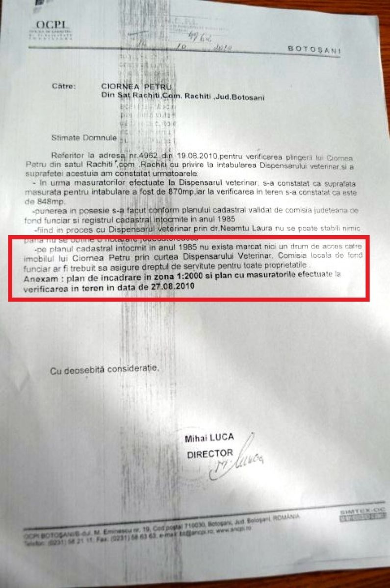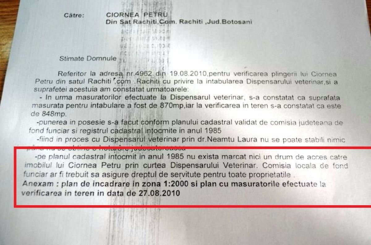 ”Urmare a adresei dv. vă facem cunoscut că suntem de acord în principiu cu folosirea accesului existent la Postul de Poliție Răchiți pentru numitul Ceornea Petru către proprietatea acestuia. Foarte clar scrie. Menționăm că accesul amintit rămâne în domeniul public al statului, pentru că vorbim de MAI, în administrarea MAI prin IPJ”, a spus și Toader Crihan, șeful Postului de Poliție Răchiți.