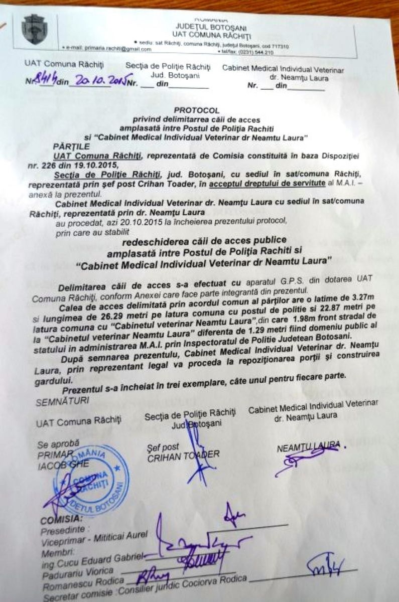 ”Noi am făcut toate demersurile, autorități locale, cu MAI și cabinetul veterinar, am făcut un protocol, avem aprobarea Poliției Județene și a Ministerului de Interne, pentru a se pune la dispoziție o parte din teren, medicul Laura Neamțu a fost de acord să ofere 1,89 m să întregească calea de acces atât cât să încapă o mașină”, a declarat Gheorghe Iacob, primarul de Răchiți.