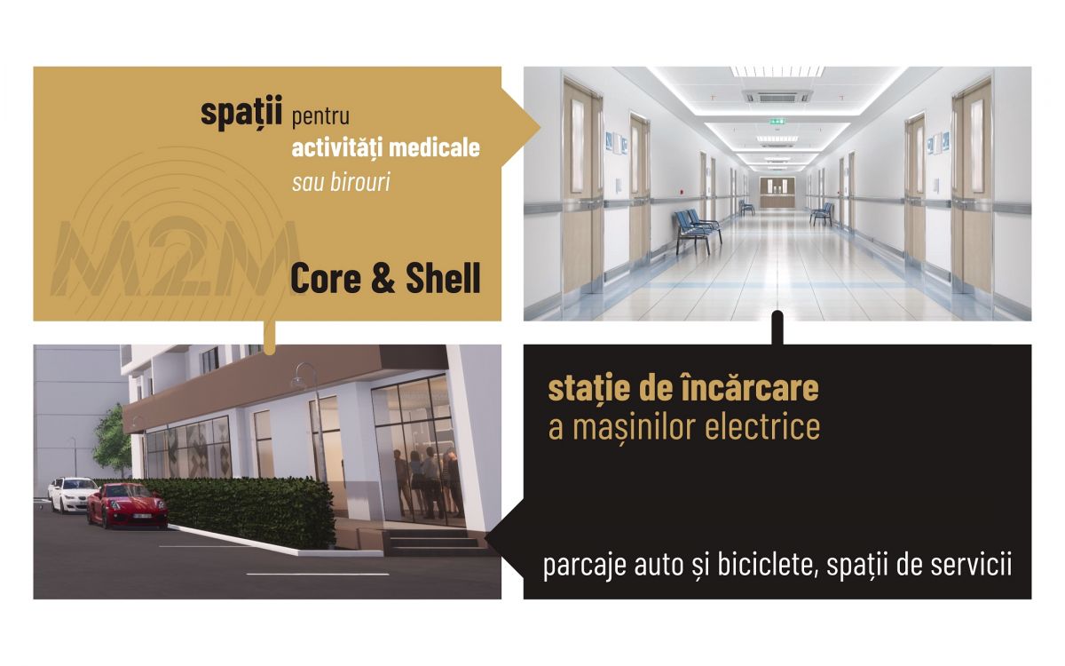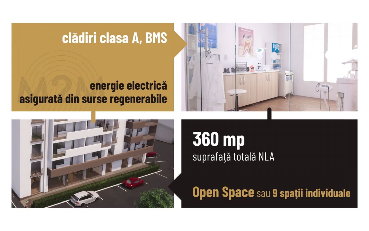 Cu un regim de înălțime P+4+5 retras, nivelul de la parter, dedicat spațiilor pentru activități medicale (centre, clinici medicale, laboratoare /puncte de preluare analize medicale, cabinete medicale, de nutriție, veterinare, stomatologice etc.) sau birouri, asigură dotări superioare, specifice unui univers concentrat pentru business, pentru un spațiu de lucru corect, de ultimă generație:
