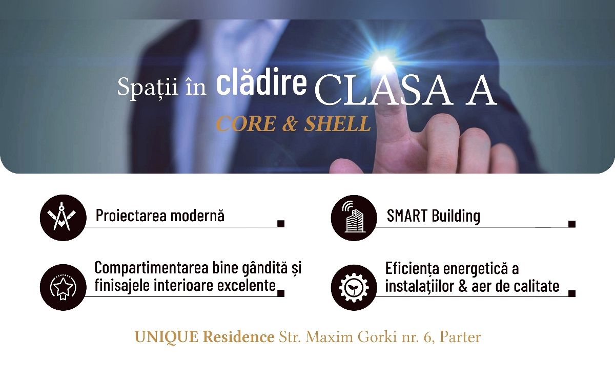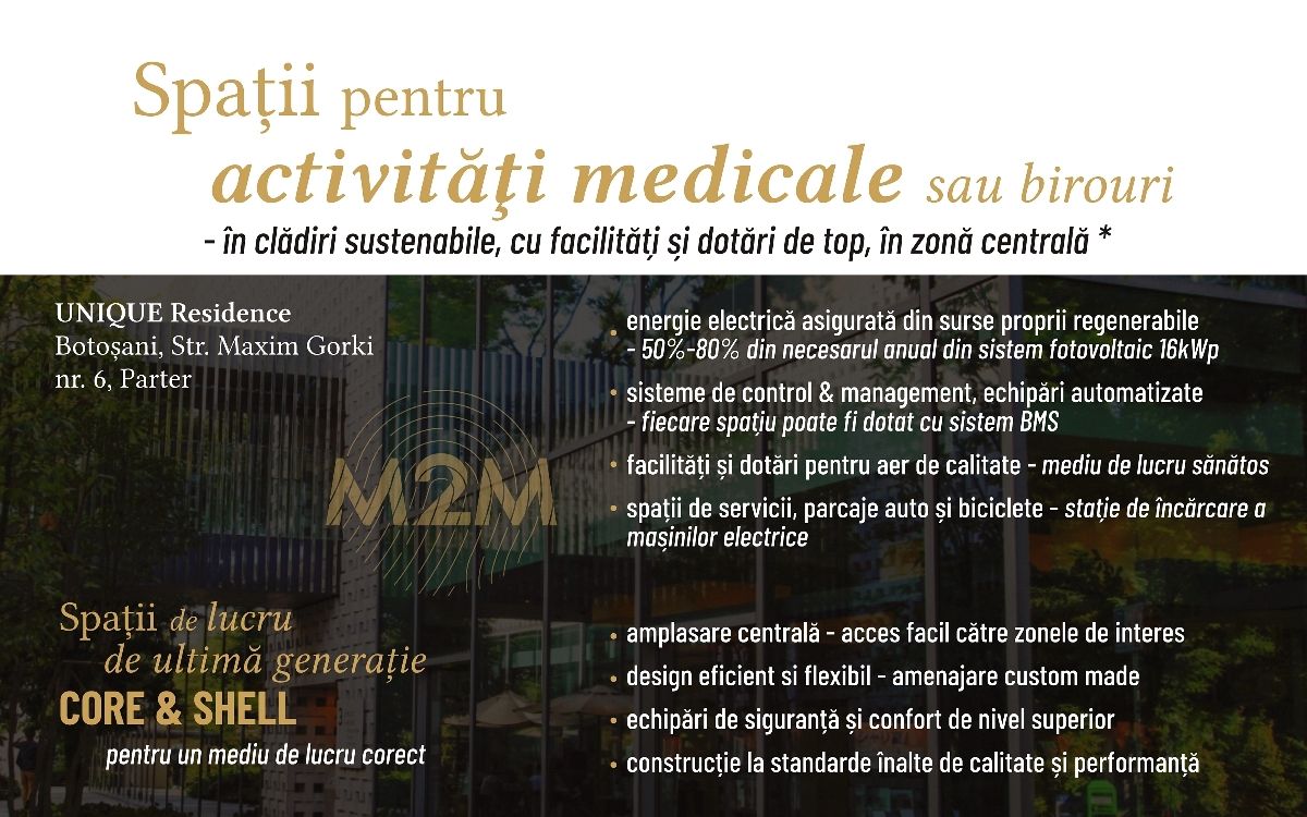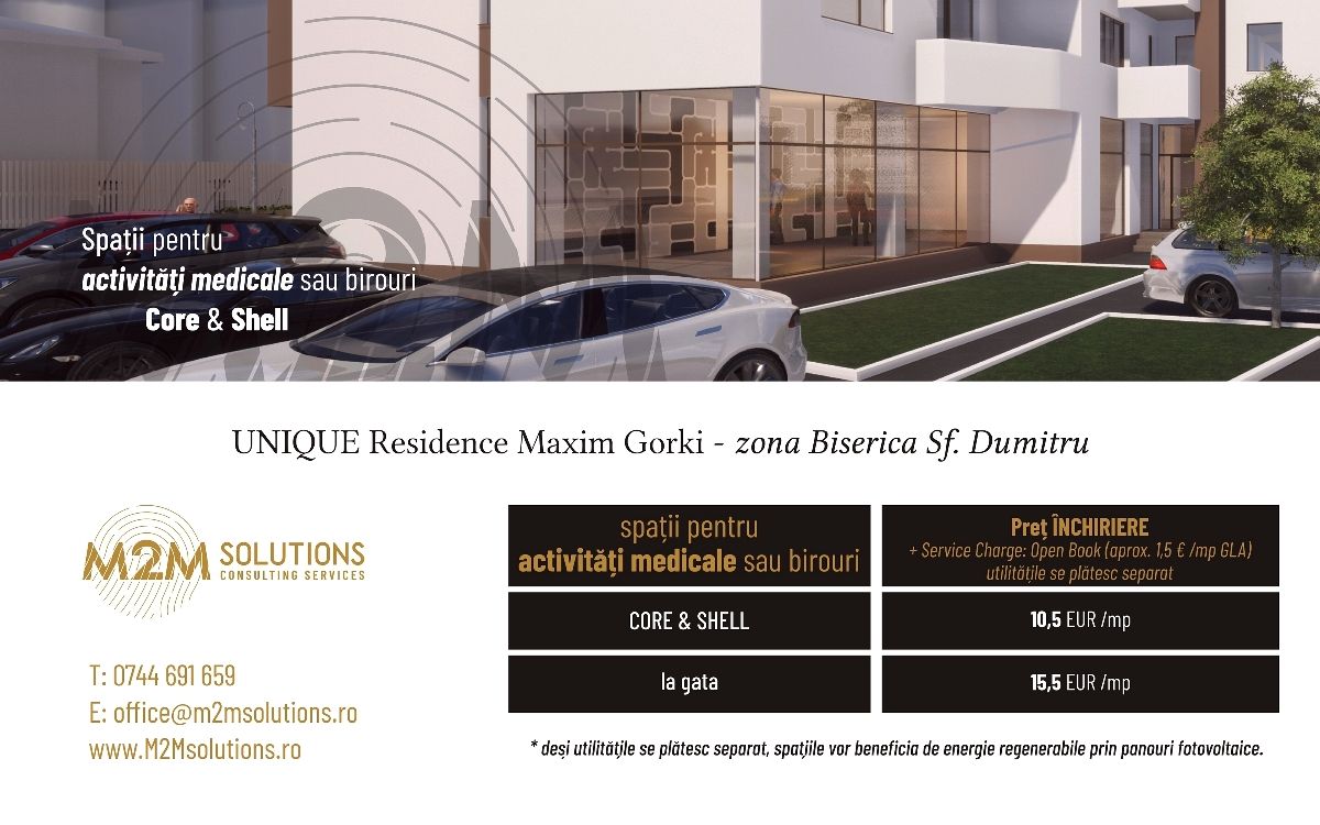 Amplasat central, cu acces facil către zonele de interes, conceput după cele mai exigente standarde de siguranță și confort, ansamblul UNIQUE Residence Maxim Gorki pune la dispoziție în zona de parter spații pentru activități medicale sau birouri, în clădiri de clasa A, la standarde înalte de calitate ale construcției, sustenabilitate și eficiență energetică: