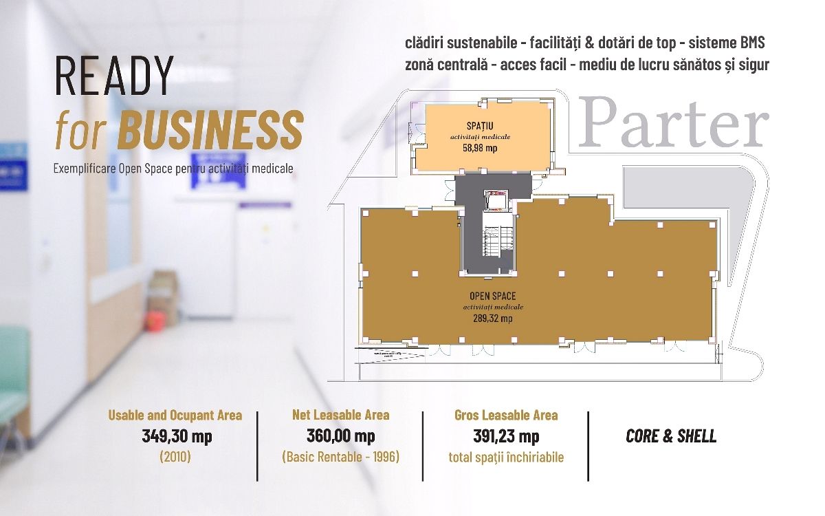 Cu un regim de înălțime P+4+5 retras, nivelul de la parter - dedicat spațiilor pentru activități medicale (clinici, cabinete, laboratoare) sau birouri - asigură dotări superioare, specifice unui univers concentrat pentru business, pentru un spațiu de lucru corect, de ultimă generație: