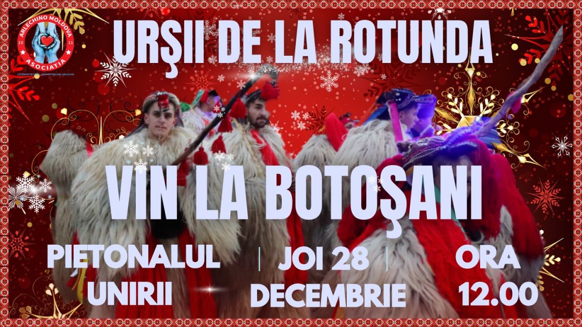 Urșii de la Rotunda vor sosi joi, 28 decembrie 2023, la Botoșani, pe Pietonalul Unirii ora 12:00, și la Săveni, pe pietonală ora 14:00, pentru a oferi un spectacol mistic în care tradiția străbună se va întâlni cu oamenii locului.