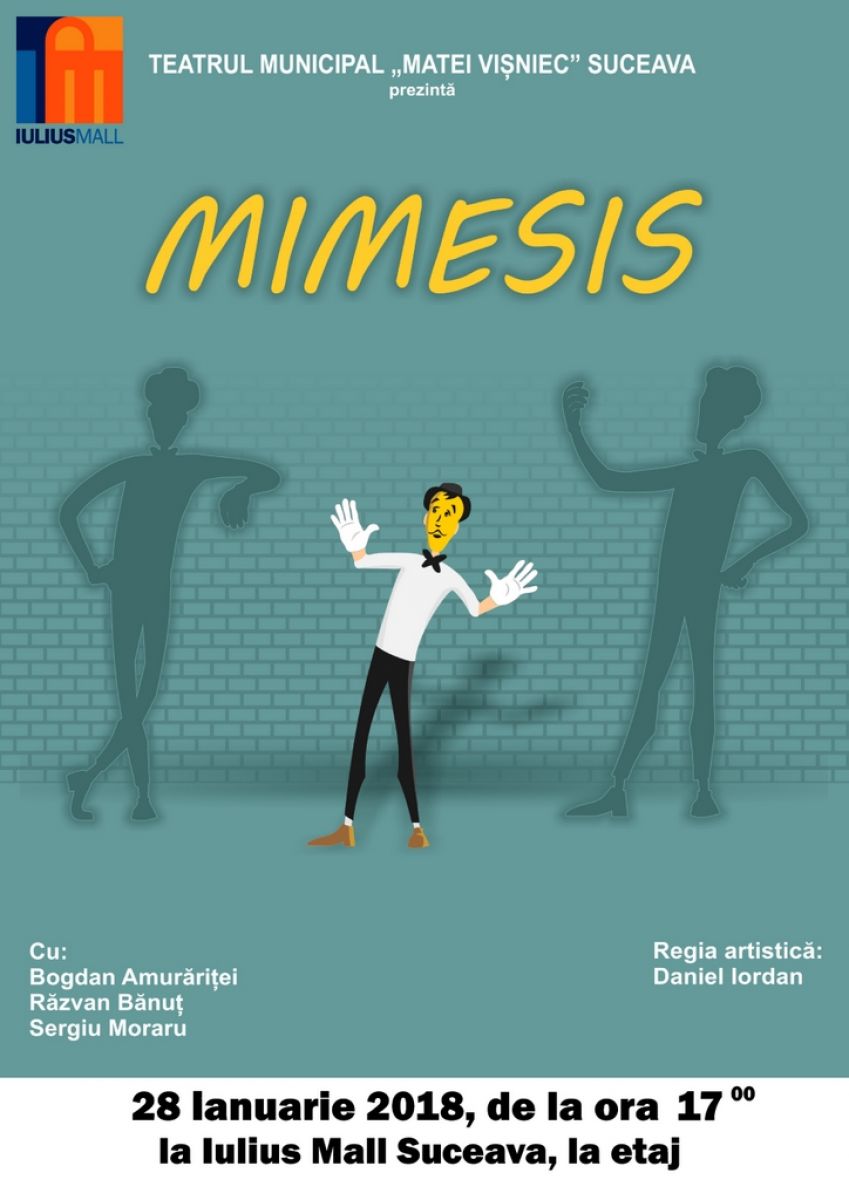 Duminică, de la ora 17.00, iubitorii artei dramaturgice primesc o invitație cu totul aparte. Iulius Mall le propune să petreacă o seară relaxantă, în compania unor actori carismatici și expresivi. Teatrul Municipal „Matei Vișniec” Suceava va prezenta în premieră producția „Mimesis”, în regia lui Daniel Iordan. Protagoniști vor fi actorii Bogdan Amurăriței, Răzvan Bănuț și Sergiu Moraru, rolurile lor fiind surprinzătoare. Și asta pentru că spectacolul are la bază mijloace de comunicare de tip nonverbal, personajele folosind mișcările și machiajul specific pentru pantomimă. Producția este una special concepută pentru spațiile neconvenționale, astfel încât clienții Iulius Mall se vor bucura de o experiență dramaturgică inedită.