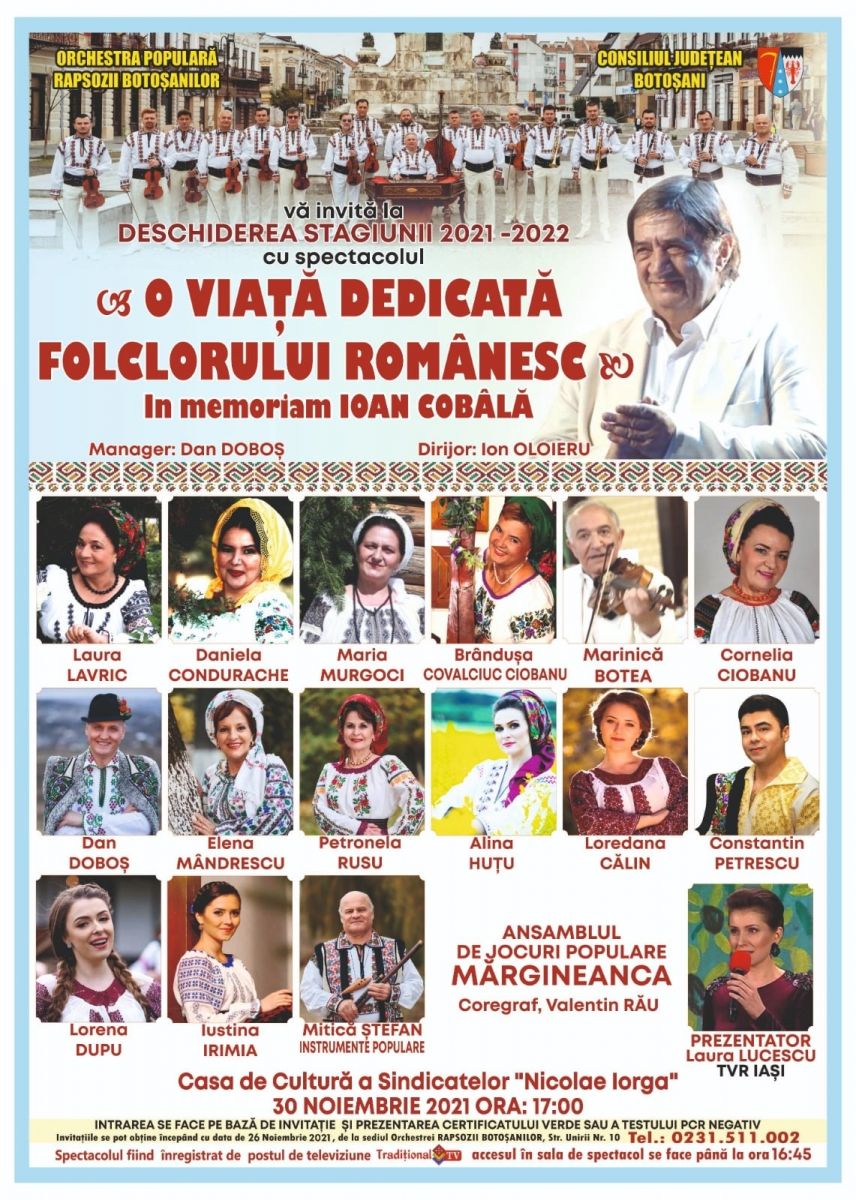 Orchestra Populară ”Rapsozii Botoșanilor” deschide stagiunea 2021-2022 cu spectacolul ”O viață dedicată folclorului românesc” - In memoriam Ioan Cobâlă.