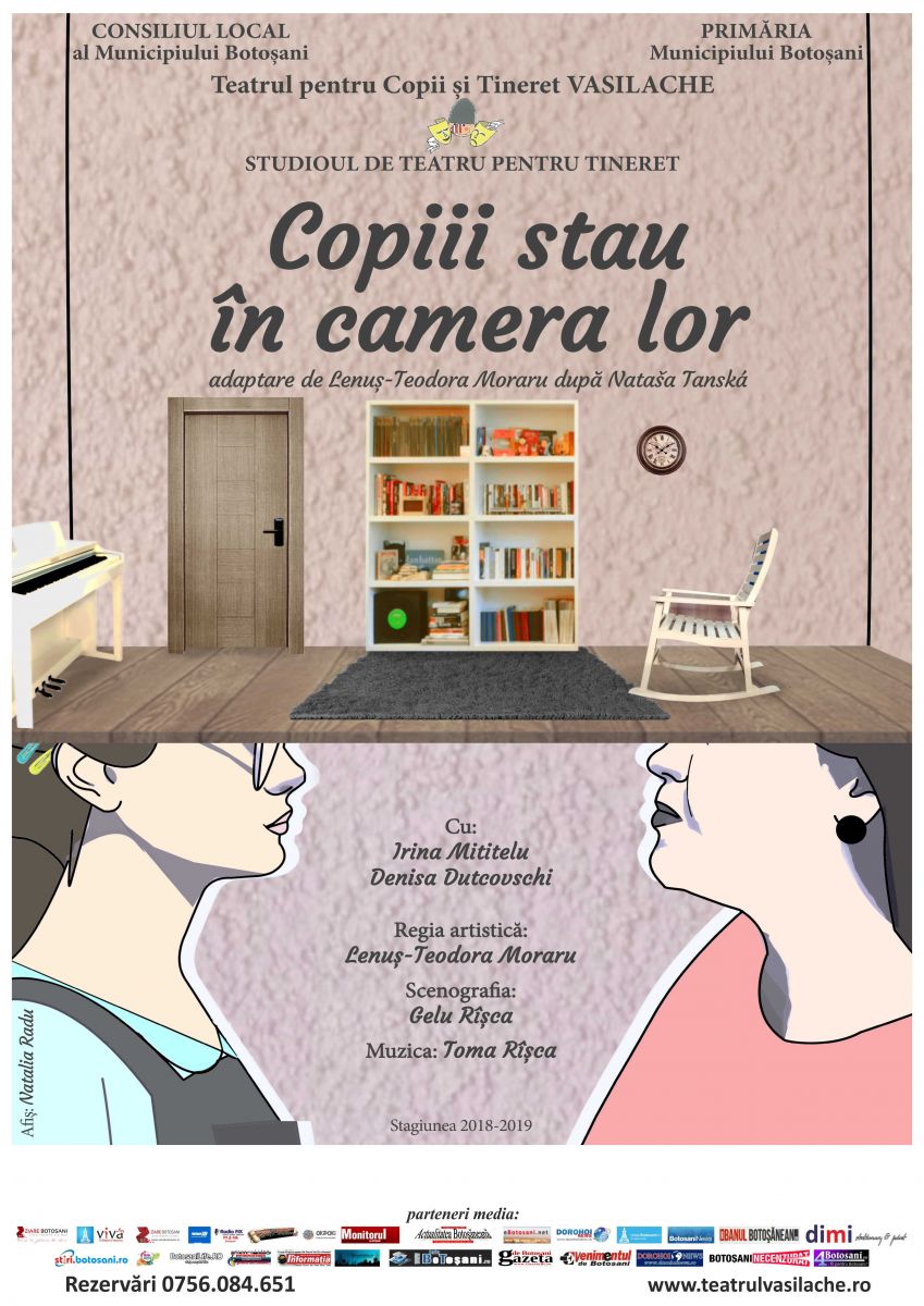 Sâmbătă 20 martie 2021, ora 18:00, în cadrul Studioului de Teatru pentru Tineret, este programat spectacolul „Copiii stau în camera lor”, adaptare de Lenuş-Teodora Moraru, după Natasa Tanská. Regia artistică: Lenuş-Teodora Moraru; scenografia: Gelu Rîşca, muzica: Toma Rîşca.