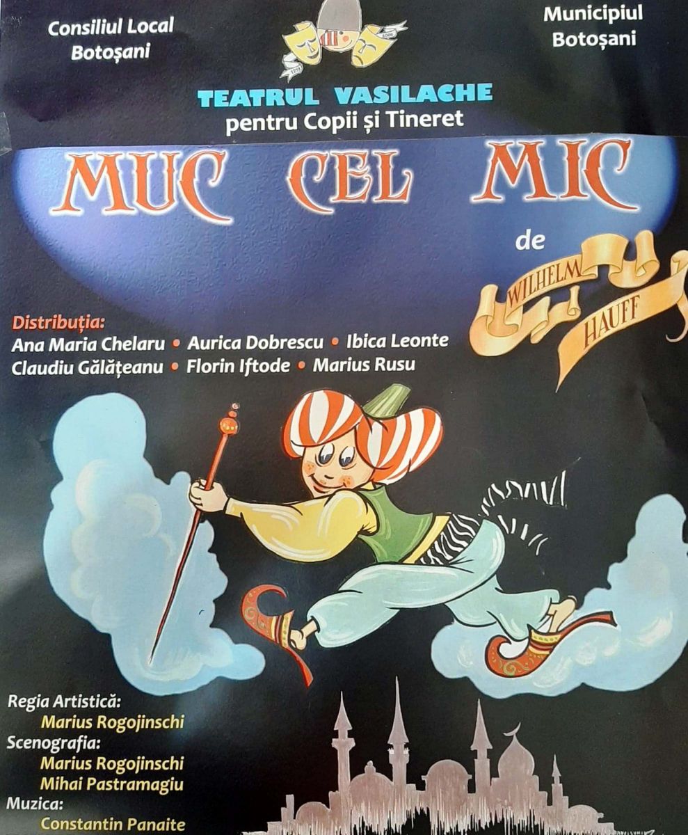 Spectacolul „Muc cel Mic”, adaptare scenică după Wilhelm Hauff, este pus în scenă de Marius Rogojinschi, scenografia este semnată de Marius Rogojinschi şi Mihai Pastramagiu, iar costumele şi păpuşile sunt realizate de Mihai Pastramagiu şi îi are în distribuţie pe îndrăgiţii actori: Andreea-Elena Popovici, Renata Voloşcu, Adelina Cojocariu, Florin Iftode, Marius Rusu, Pavel Petraşi, Andrei Bordianu, Anamaria Chelaru