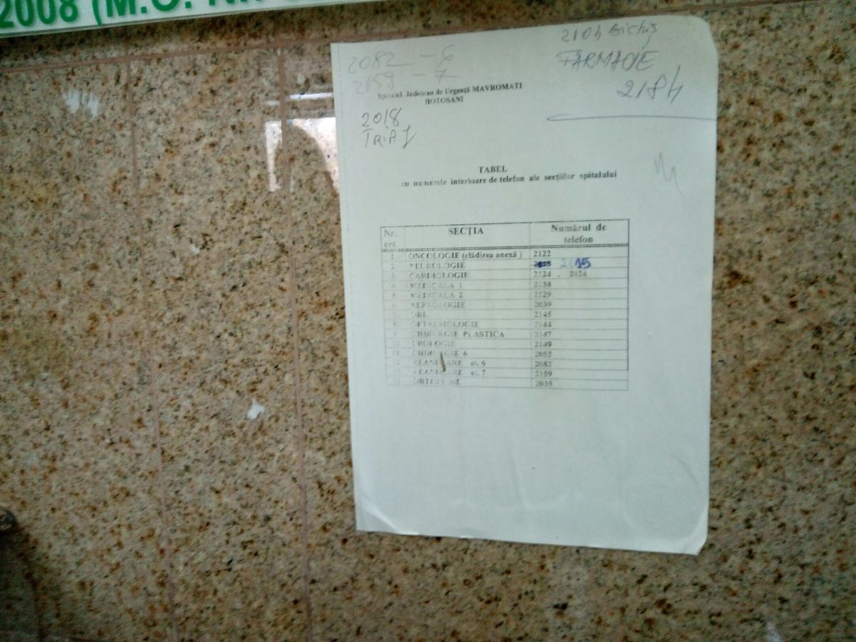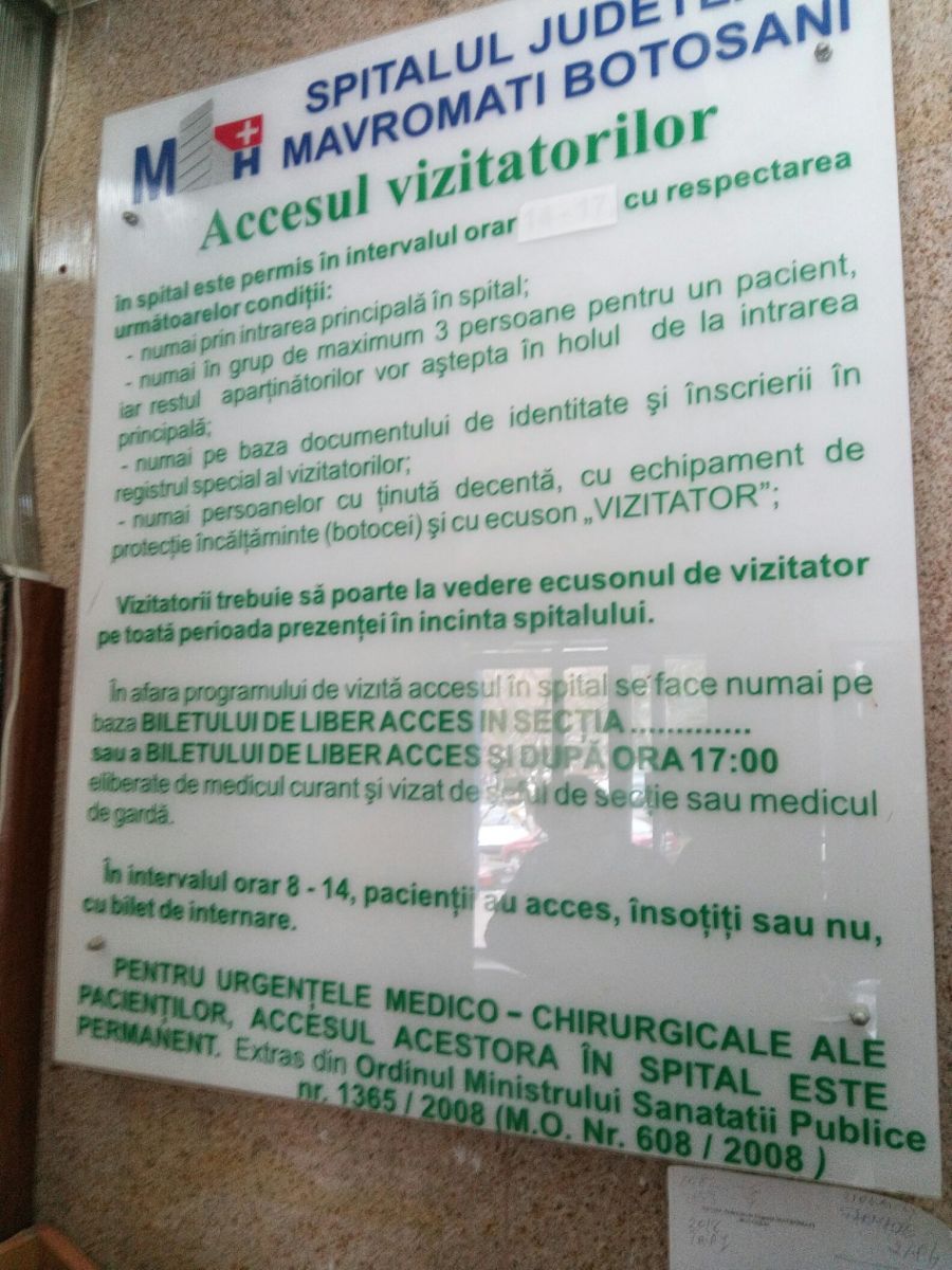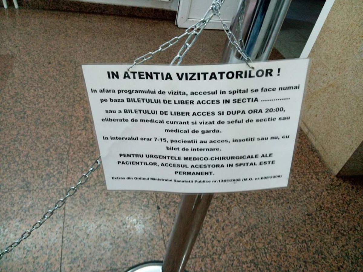 În afara programului de vizite, oamenii pot intra doar dacă au bilet de liber acces eliberat de medicul curant şi vizat de şeful de secţie sau medicul de gardă. Mai există şi un telefon şi o hârtie cu numerele secţiilor dar rar răspunde cineva, după cum azi o femeie care voia să-i ducă pastilele mamei sale a simțit pe propria-i piele. În cele din urmă a cerut să vorbească cu conducerea.