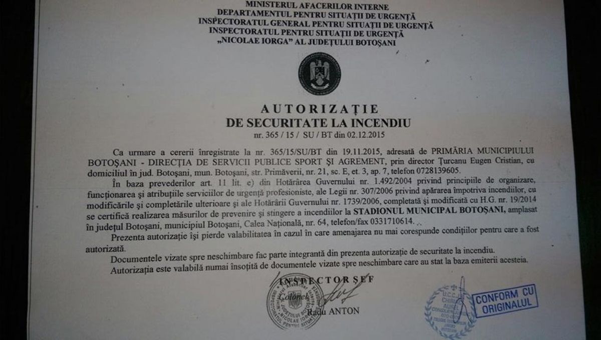 Prin urmare, arena sportivă botoșăneană îndeplinește, în acte, toate condițiile de siguranță care se impun. ”Ca urmare a cererii înregistrare, adresată Primăriei municipiului Botoșani – Direcția de Servicii Publice Sport și Agrement prin director Țurcanu Eugen Cristian, (...) în baza prevederilor din Hotărârea Guvernului privind principiile de organizare, funcționare și atribuțiile serviciilor de urgență profesioniste ale Legii privind apărarea împotriva incendiilor, cu modificările și completările ulterioare ale Hotărârii Guvernului (…), se certifică realizarea măsurilor de prevenire și stingere a incendiilor la Stadionul Municipal Botoșani, amplasat în județul Botoșani, municipiul Botoșani, Calea Națională”, se arată în autorizația de securitate la incendiu.