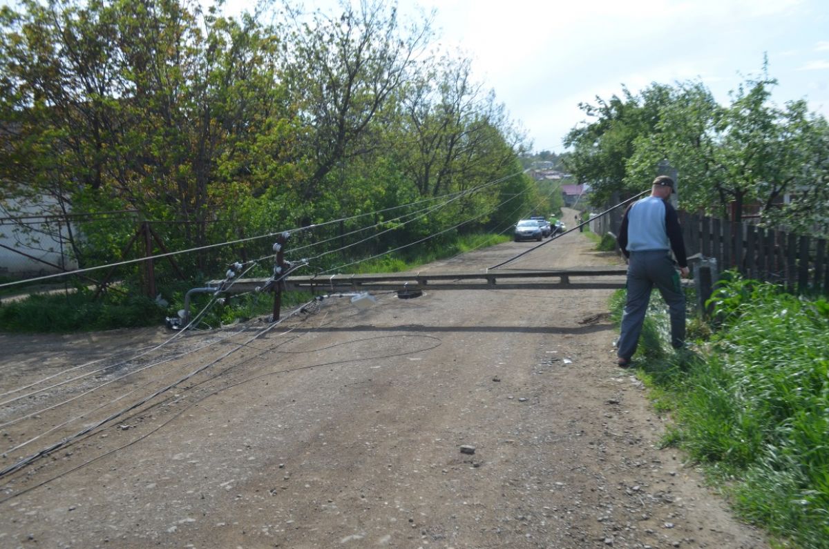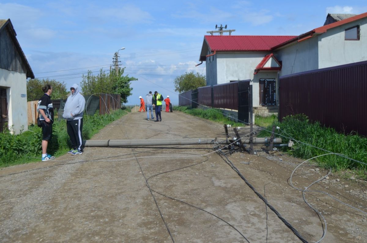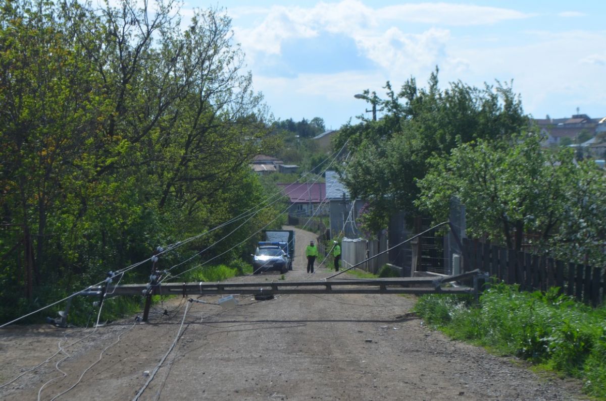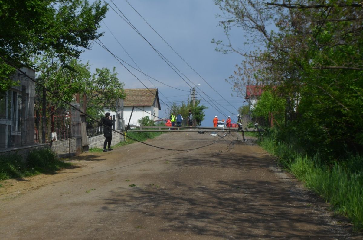 S-au deplasat pe strada Gheorghe Hasnaș și polițiștii locali și rutieri dar și echipaje ale ISU și E.ON. Cei doi stâlpi vor fi ridicați cel mai probabil cu o macara. (G.E.)