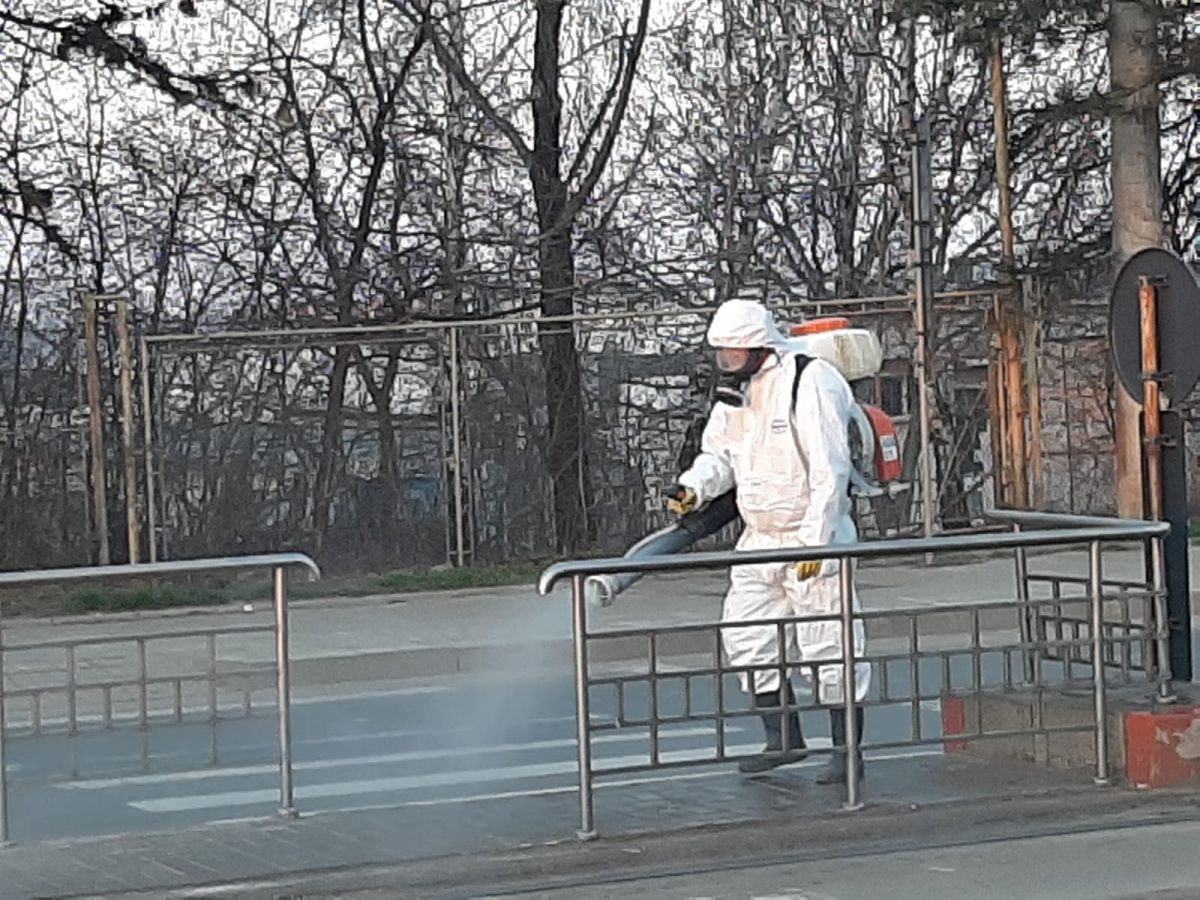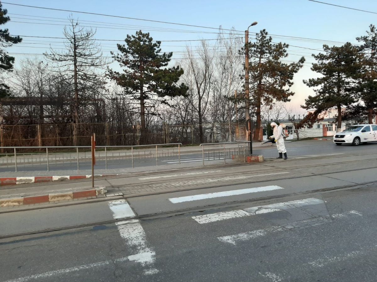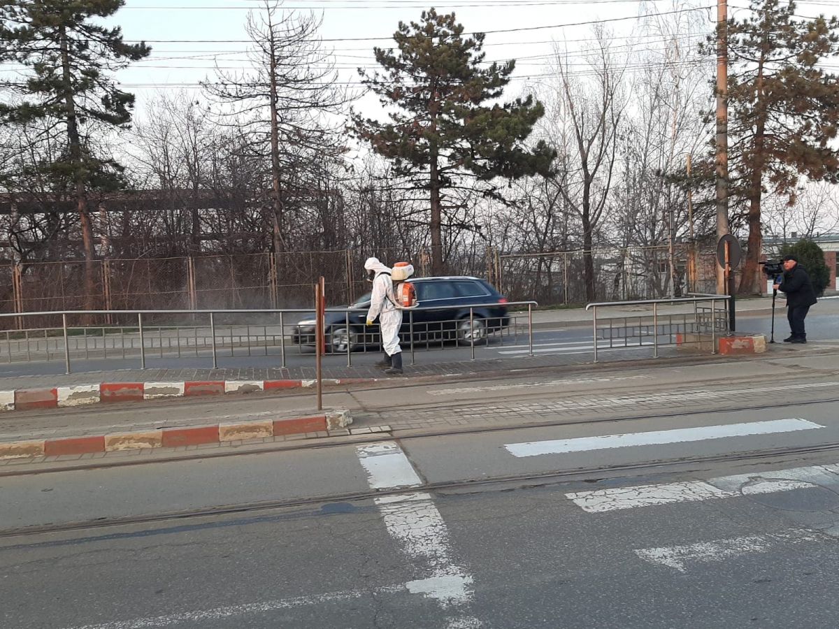 S-a început din Zona Industrială cu stațiile de tramvai sau maxi taxi. Muncitori de la compania de salubrizare, îmbrăcați corespunzător au împrăștiat material dezinfectant ca măsură pentru împiedicarea răspândirii noului virus în oraș.