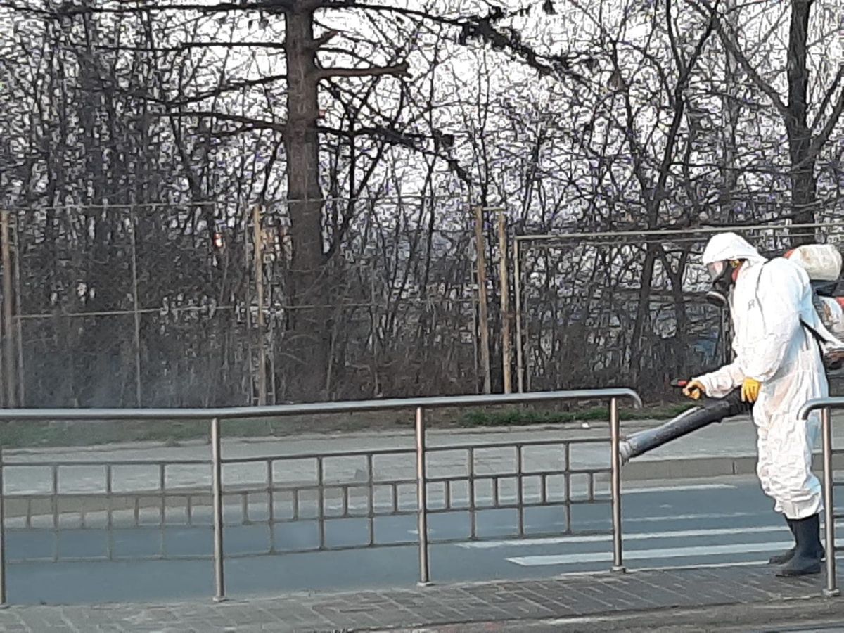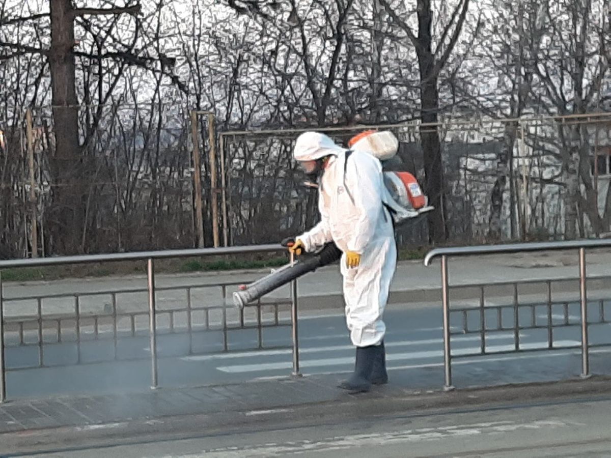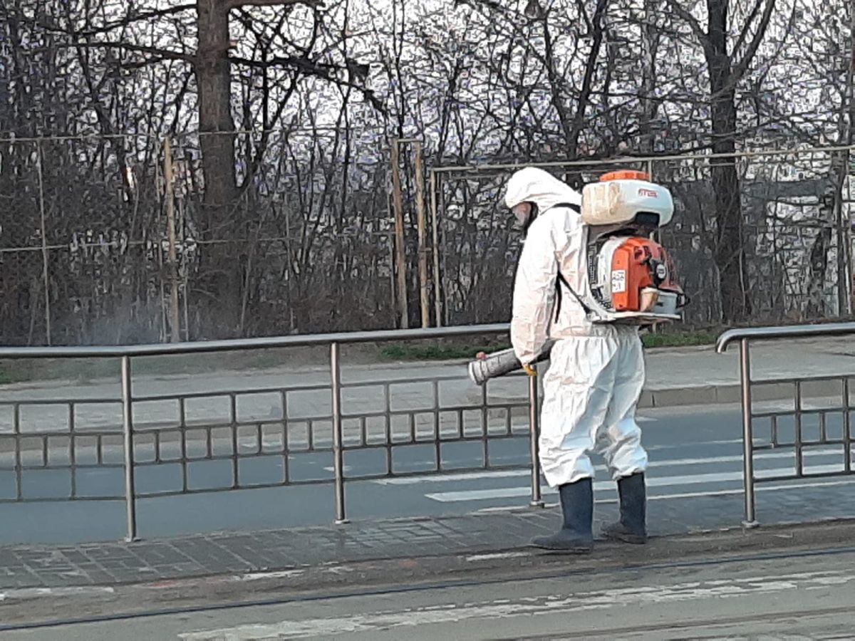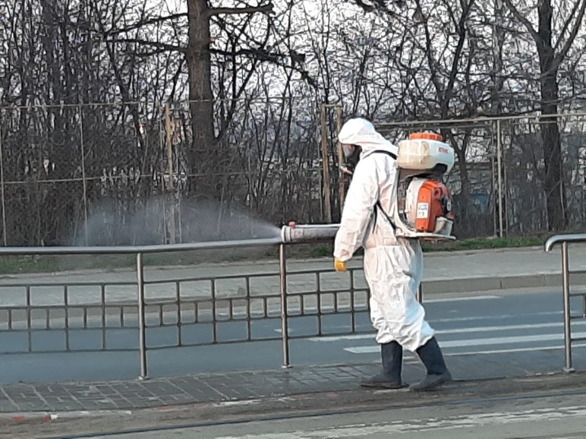 S-a început din Zona Industrială cu stațiile de tramvai sau maxi taxi. Muncitori de la compania de salubrizare, îmbrăcați corespunzător au împrăștiat material dezinfectant ca măsură pentru împiedicarea răspândirii noului virus în oraș.