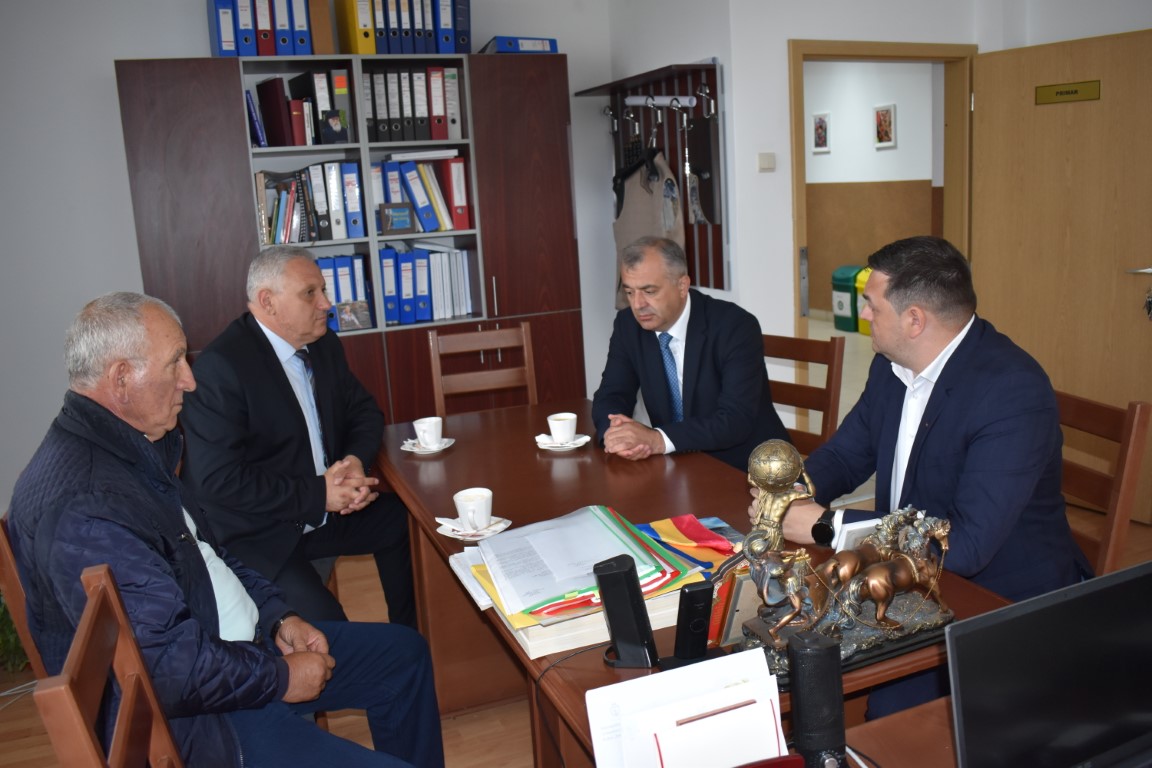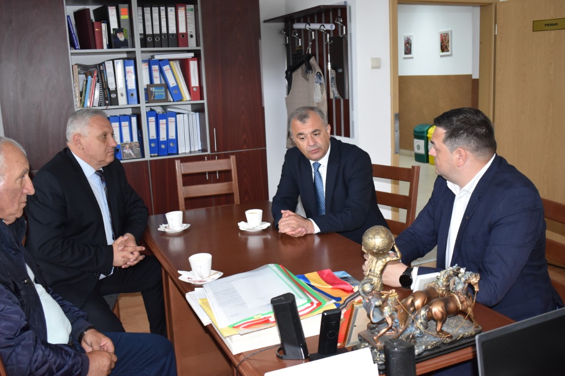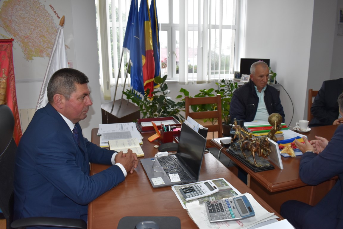 În biroul primarului, așezați față în față, invitații la eveniment, de la Botoșani prefectul Sorin Cornilă iar din Republica Moldova, Ion Chicu, fost prim ministru din perioada 2019 – 2020 și Igor Grozavu, primarul comunei Gribova din raionul Drochia.