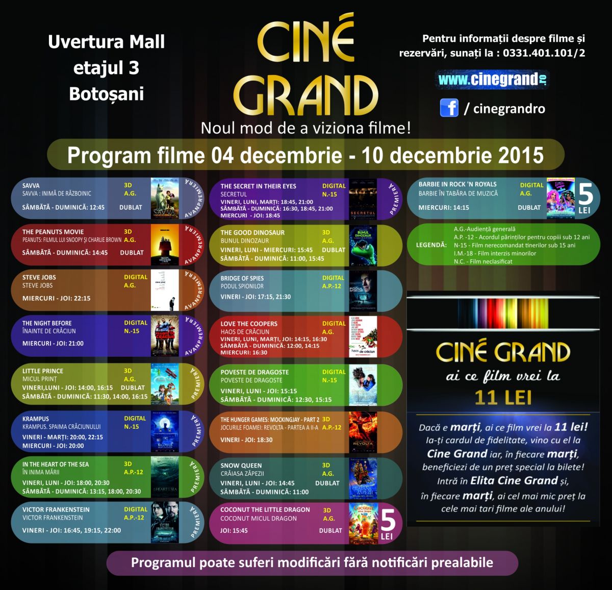 De asemenea, botoșăneni vor mai putea viziona filmele: Savva: Savva, inimă de războinic, The Peanuts movie (Filmul lui Snoopey și Charlie Brown), The Night Before ( Înainte de Crăciun).