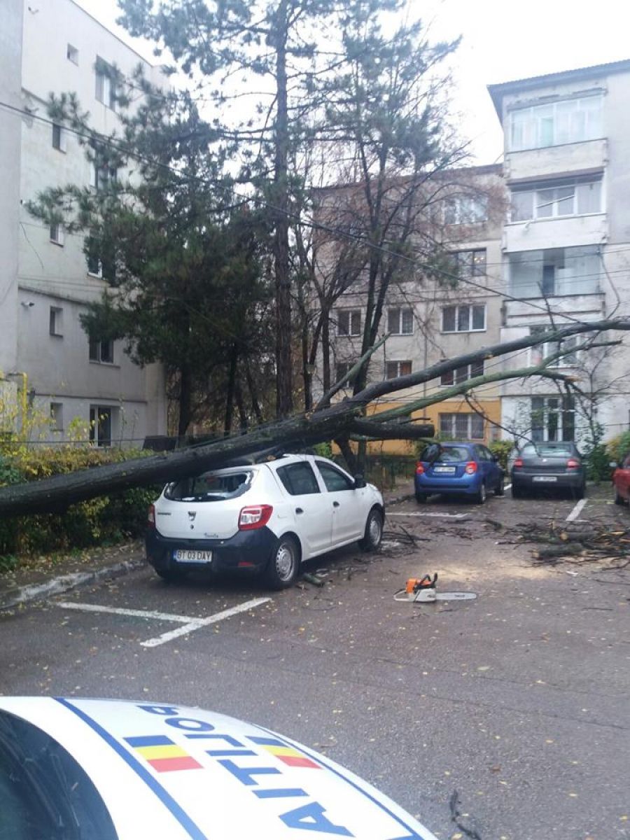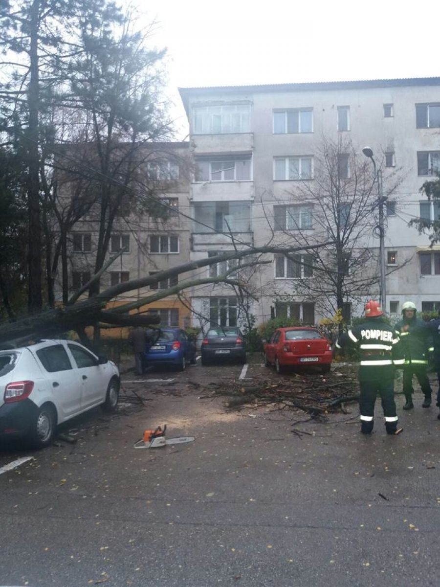 Cea mai avariată este o Dacia Sandero peste cupola căreia a căzut arborele. Alte două autoturisme au fost deja îndepărtate de pompieri.