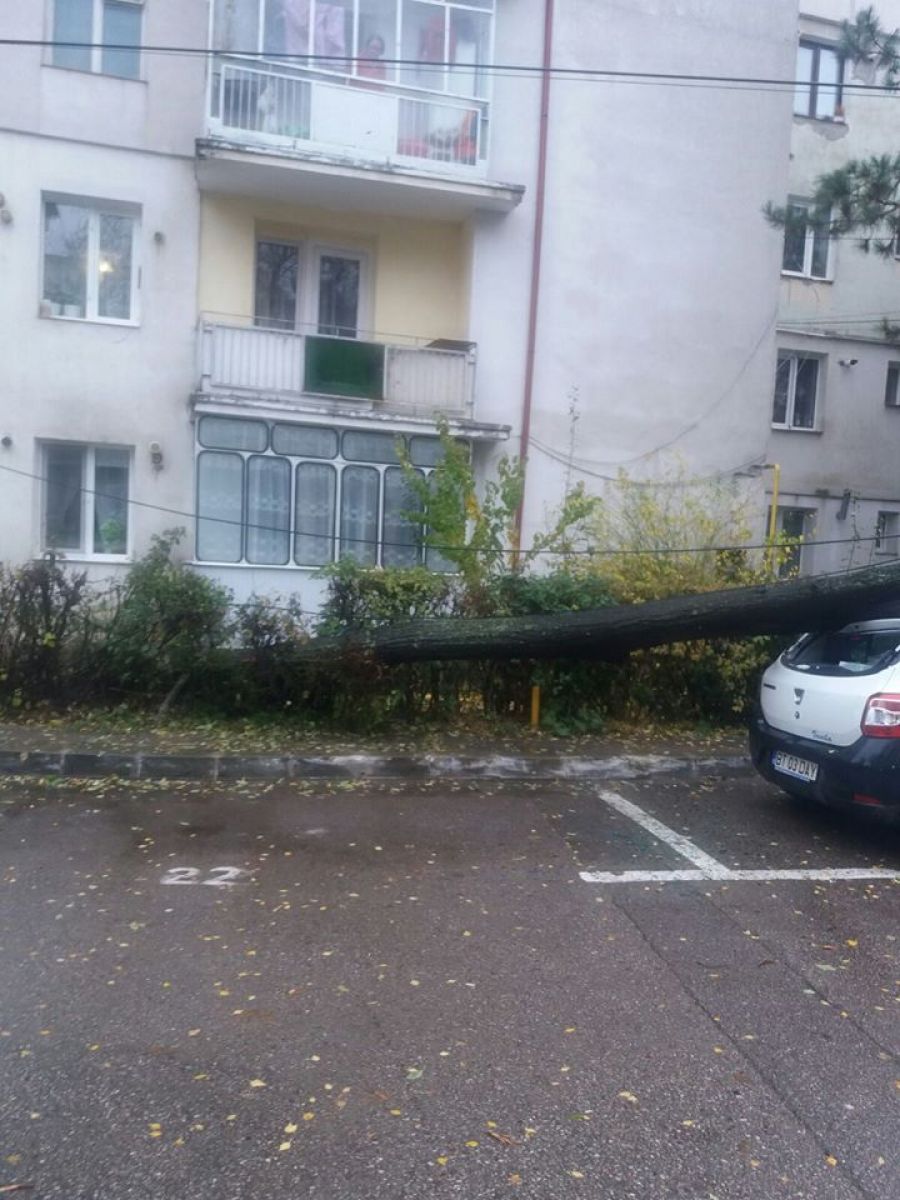 S-a întâmplat în urmă cu puține minute pe strada Octav Onicescu din municipiul Botoșani. Copacul, din cauza umidității excesive a ieșit la propriu din rădăcini și a căzut peste mașinile parcate lângă bloc.