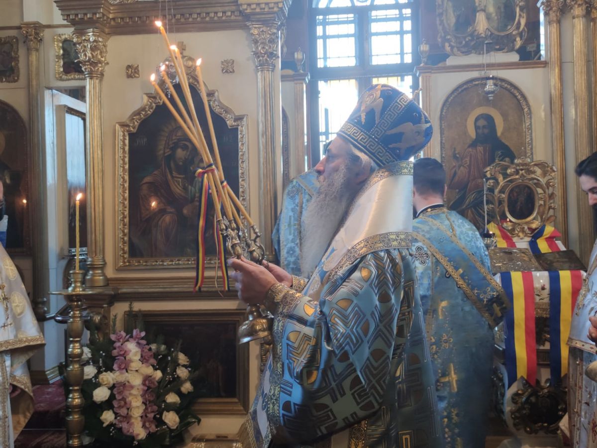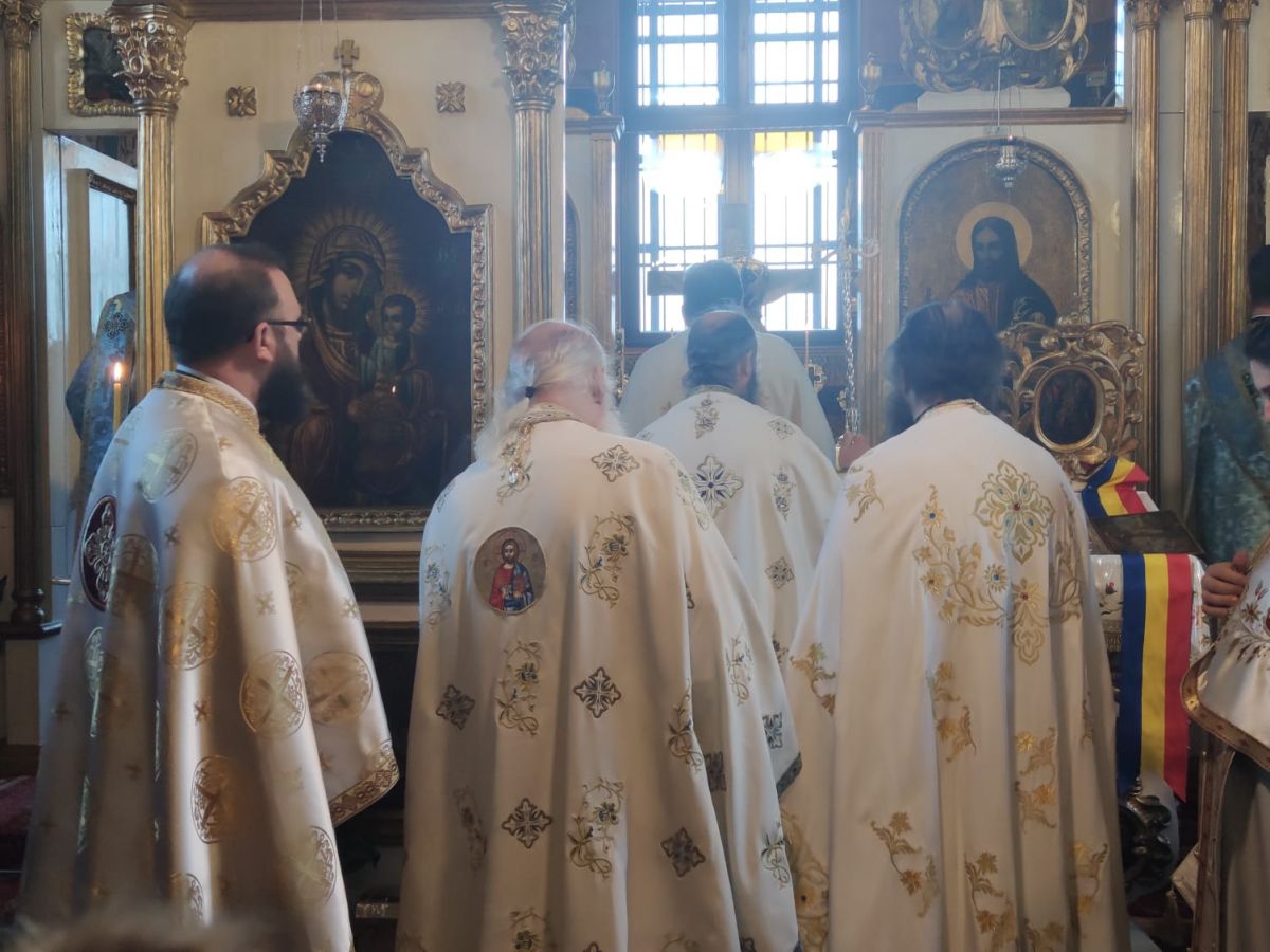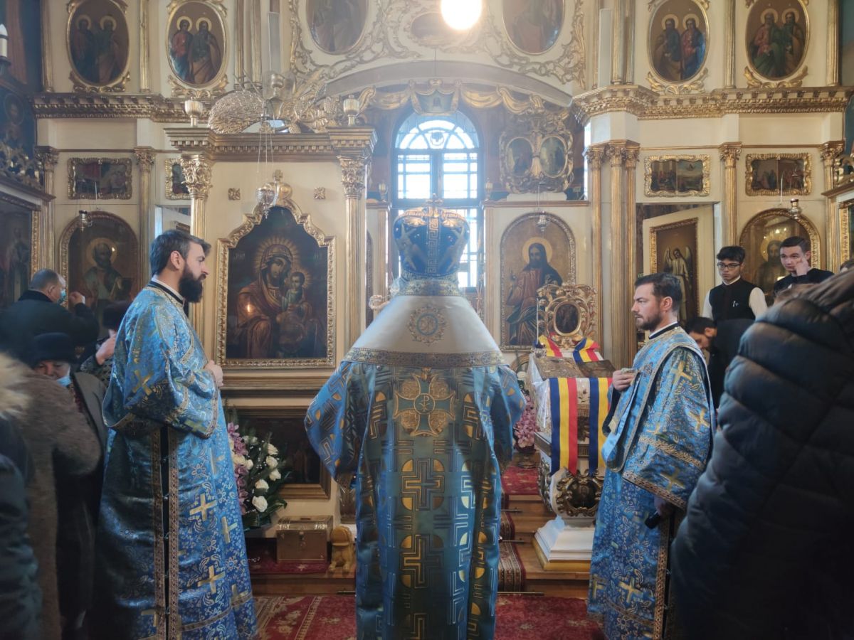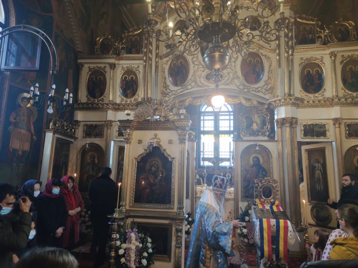 Un sobor de preoți și IPS Teofan, Mitropolitul Moldovei și Bucovinei, alături de preotul paroh Petru Fercal, protopop de Botoșani, săvârșesc Sfânta Liturghie.