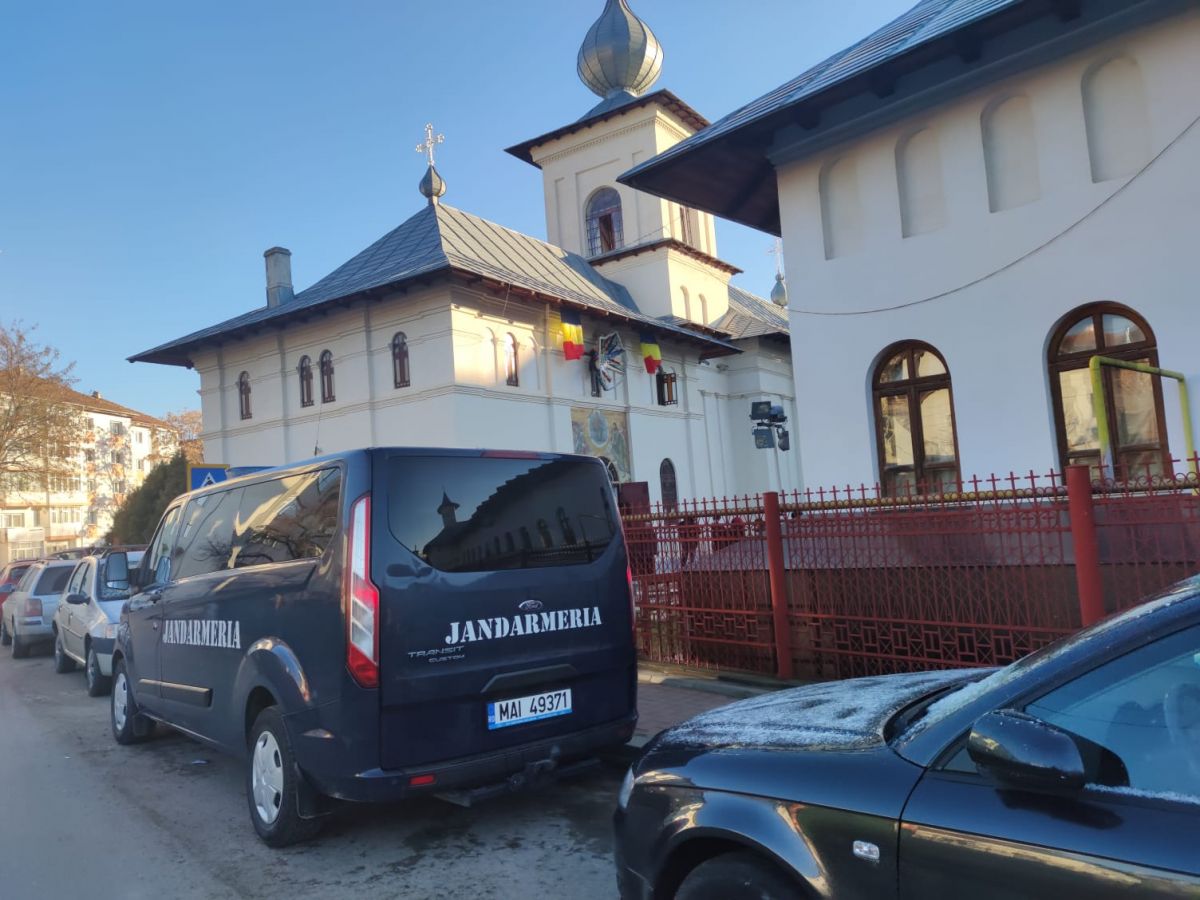 Biserica este plină, fiind credincioși care stau răsfirați și afară.