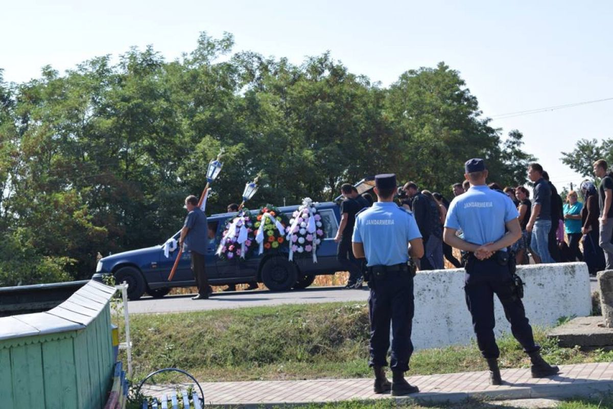 De pe margine, jandarmi și polițiști rutieri asigură ordinea desfășurării funeraliilor. Preotul din comună oficiază ceremonialul religios. (G.E.)