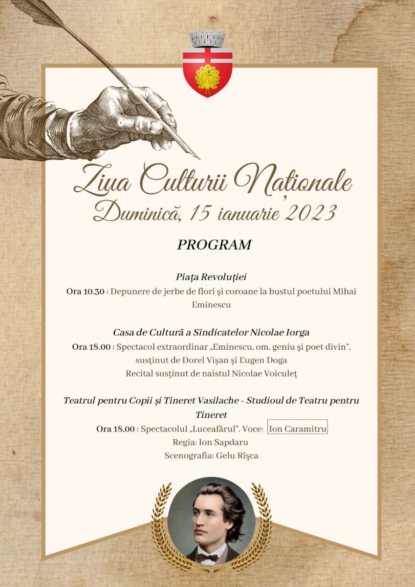 Ziua Culturii Naționale va fi marcată pe data de 15 ianuarie 2023, de Primăria Municipiului Botoșani, în parteneriat cu instituțiile de cultură subordonate Consiliului Local Botoșani, printr-o serie de evenimente.