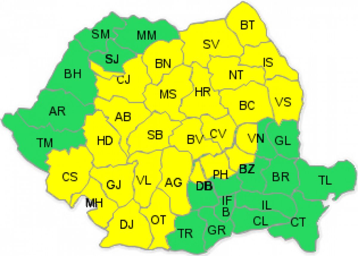 Începând de sâmbătă dimineaţa de la ora 9:00, avertizarea COD GALBEN de la meteorologi va fi extinsă pentru mai multe judeţe. În intervalul 18 iunie, ora 9:00 – 19 iunie, ora 9:00, în sud-vestul, centrul şi nord-estul ţării, precum şi în zona montană instabilitatea atmosferică va deveni deosebit de accentuată. Vor fi averse torenţiale, frecvente descărcări electrice, intensificări de vânt cu aspect de vijelie şi va cădea grindină. Cantităţile de apă vor depăşi local 15...20 l/mp şi izolat 30...40 l/mp.