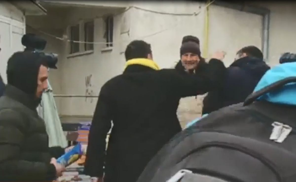 După doar câteva minute cameramanul din coloana AUR a repetat gestul în sectorul de comercializare dinspre Biserica Sfântul Gheorghe, unde a lovit cu palma peste cap o botoșăneancă, nemulțumit probabil pentru că i-a intrat în cadru.