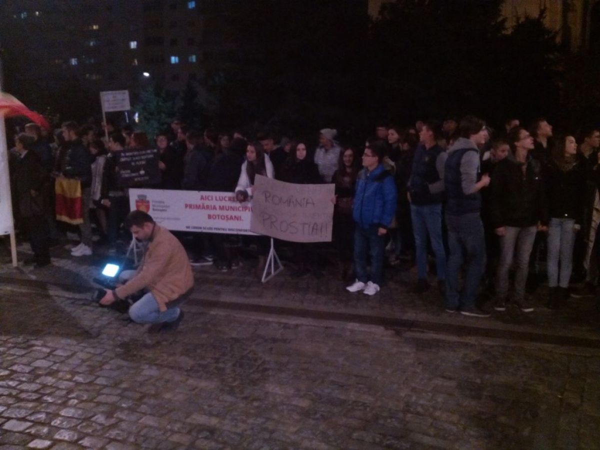 Astfel, în faţa Muzeului Judeţean, s-au strâns circa 1.000 de oameni care au păstrat un moment de reculegere în memoria victimelor incendiului din clubul Colectiv. Înainte de asta, pe bulevarul Mihai Eminescu, s-a scandat: Afară, afară cu javrele din ţară, devenind tot mai clar faptul că, asemenea bucureştenilor şi românilor din alte oraşe, botoşănenii nu se mulţumesc doar cu demisia Cabinetului Ponta. Coloana a coborât pe Pietonalul Unirii, spre Piaţa Revoluţiei. (M.H.)