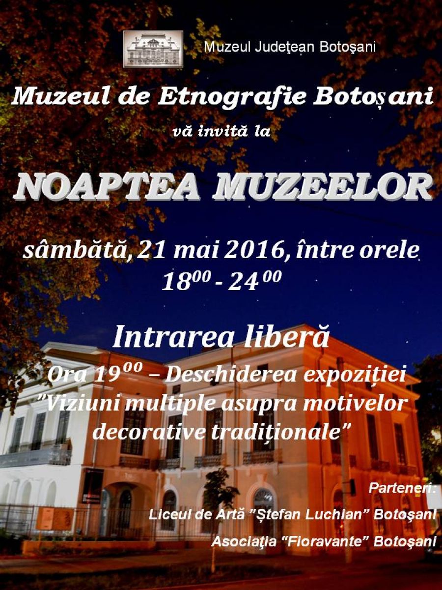 Astfel, între orele 18.00–24.00 vor fi deschise publicului, gratuit, Muzeul de Istorie şi Muzeul de Etnografie Botoşani. La Muzeul de Istorie vor putea fi vizitate expoziţia permanentă, precum şi expoziţiile temporare „Botoşanii lui Eminescu” şi „Monarhia constituţională în România - 150” (2 lei taxa de vizitare), care reuneşte piese reprezentative pentru Casa Regală a României, aflate în colecțiile Muzeului Național Peleș și ale Complexului Muzeal Național Moldova, Iași. Muzeul de Etnografie va prezenta expoziţia permanentă, iar de la ora 19.00 vizitatorii vor putea participa la vernisajul expoziţiei de artă plastică „Viziuni multiple asupra motivelor decorative tradiționale”, realizată în parteneriat cu Liceul de Artă „Ştefan Luchian” Botoșani și Asociația „Fioravante” Botoșani.