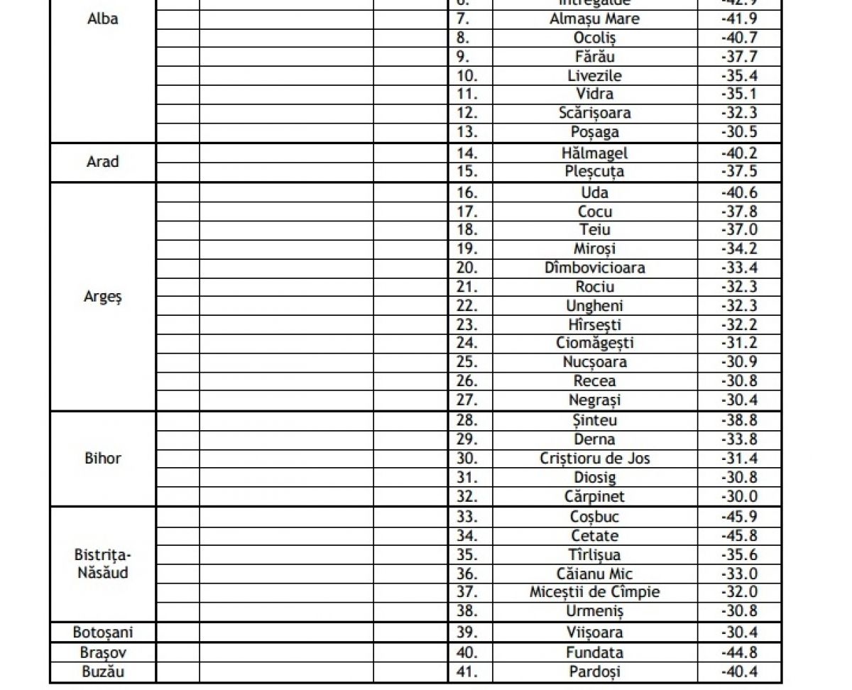 Anexa realizată de Guvern, intitulată „Municipiile, orașele și comunele în care s-au produs scăderi accentuate ale populației”, cuprinde un tabel cu comunele care au pierdut peste 30% din populație în intervalul menționat, o statistică a orașelor și a municipiilor care au pierdut peste 20% din populație, dar și lista municipiilor, orașelor și comunelor care au în structura lor sate cu mai puțin de 100 locuitori, potrivit jurnaliștilor de la Stiri pe surse.