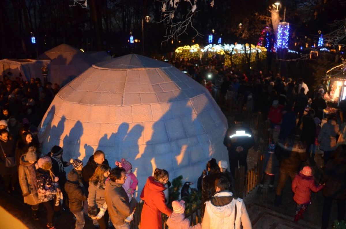 Sutele de oameni au pornit în explorare. Cei mici și-au băgat capetele în corpul unui urs polar peste care ningea deja pentru a se fotografia. Alții, ca un val, au curs spre cele două iglu care au fost luate cu asalt. Micul tur s-a transformat într-un șuvoi de copii, cei mai nerăbdători nu au mai avut răbdare și au sărit gardurile, așa că a fost nevoie și de polițiștii locali.