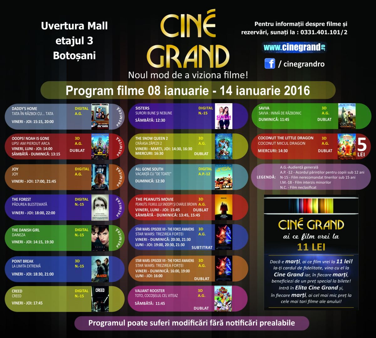 Te plictisești în casă și ai vrea să te uiți la un film? Cine Grand Botoșani a pregătit în perioada 8 – 14 ianuarie 2016, mai multe pelicule de acțiune , dramă, comedie sau horror în premieră pe marile ecrane. Așadar, cei care doresc să facă o plimbare până la Uvertura Mall, printre sesiunea de shopping, pot consulta și programul cu filmele săptămânii care este atașat mai jos.