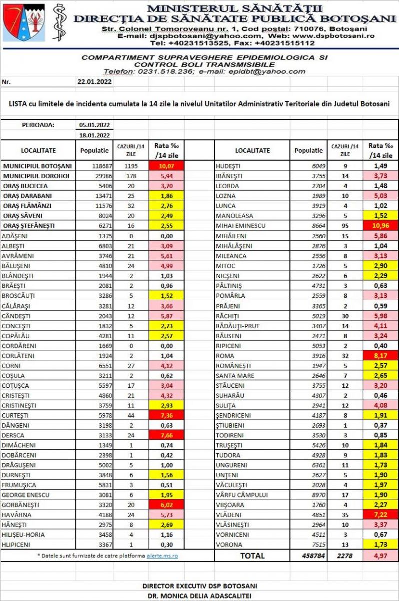 De cealaltă parte, avem două localități în care nu s-a înregistrat vreo infecție: Adășeni și Cordăreni, ambele având rata 0.