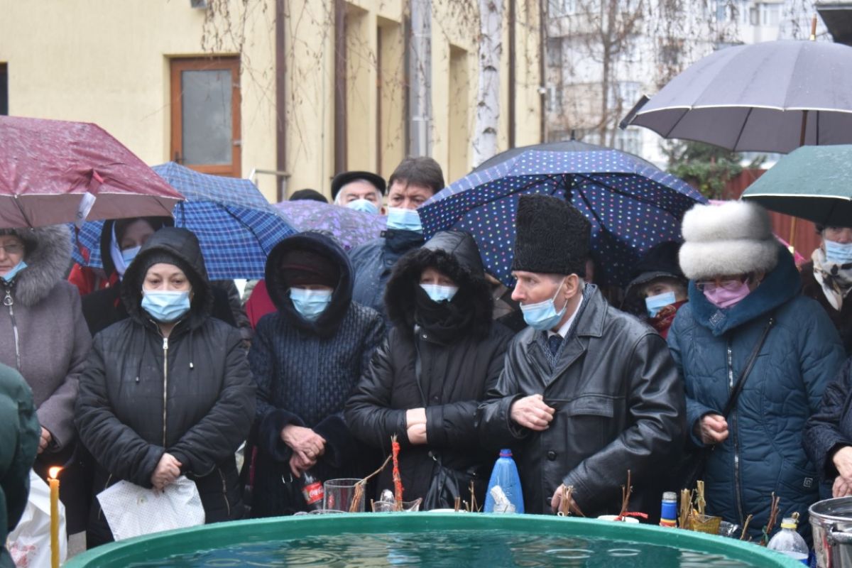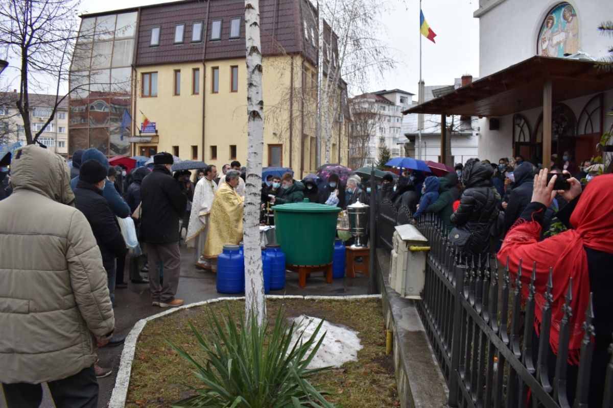 Sub o ploaie amestecată cu lapoviță și un frig pătrunzător, zeci de credincioși s-au adunat în curtea Capelei Militare de la Botoșani pentru slujba de Bobotează.