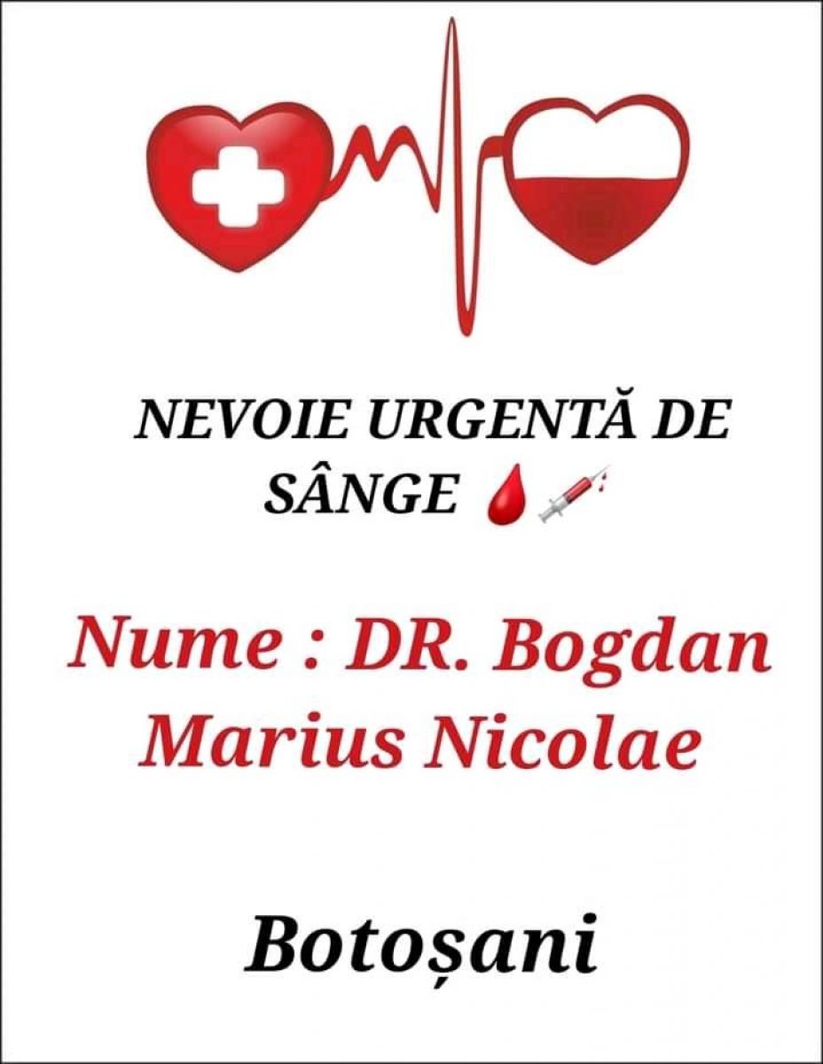 ”Căutam urgent donatori, indiferent de grupa sanguină, pentru domnul doctor Bogdan Marius - Nicolae! Se oferă recompensă! Cine dorește se poate prezenta la Centrul De Transfuzie Botoșani”,