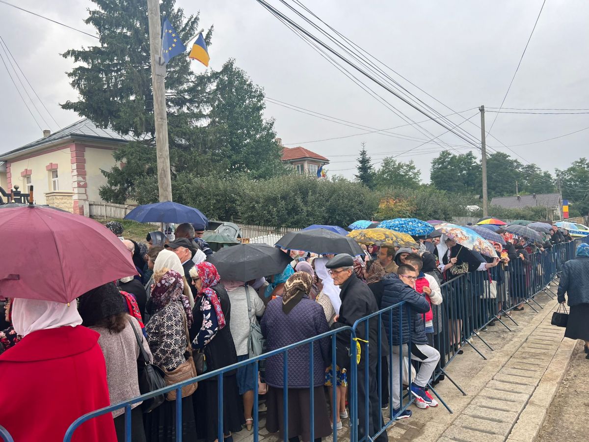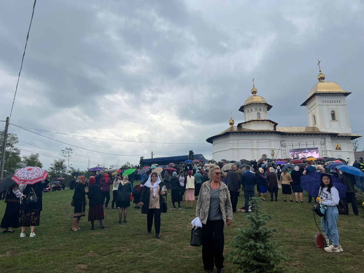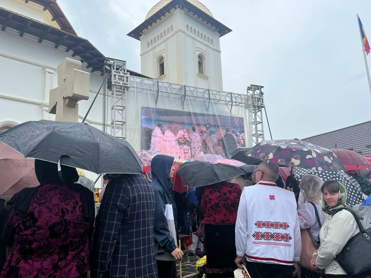 Oamenii au venit cu umbrele, pentru că din cer cade o ploaie măruntă. Mulți credincioși poartă straie populare. Slujba de sfințire are loc în afara bisericii, într-un spațiu special pregătit în acest sens. Organizatorii au montat afară și un ecran uriaș pentru ca toată lumea să poată urmări slujba religioasă.