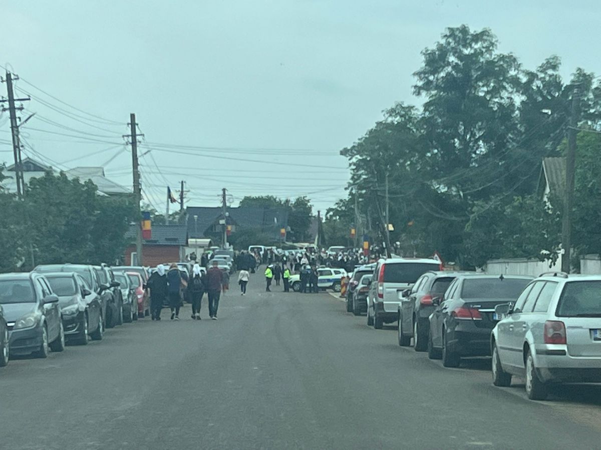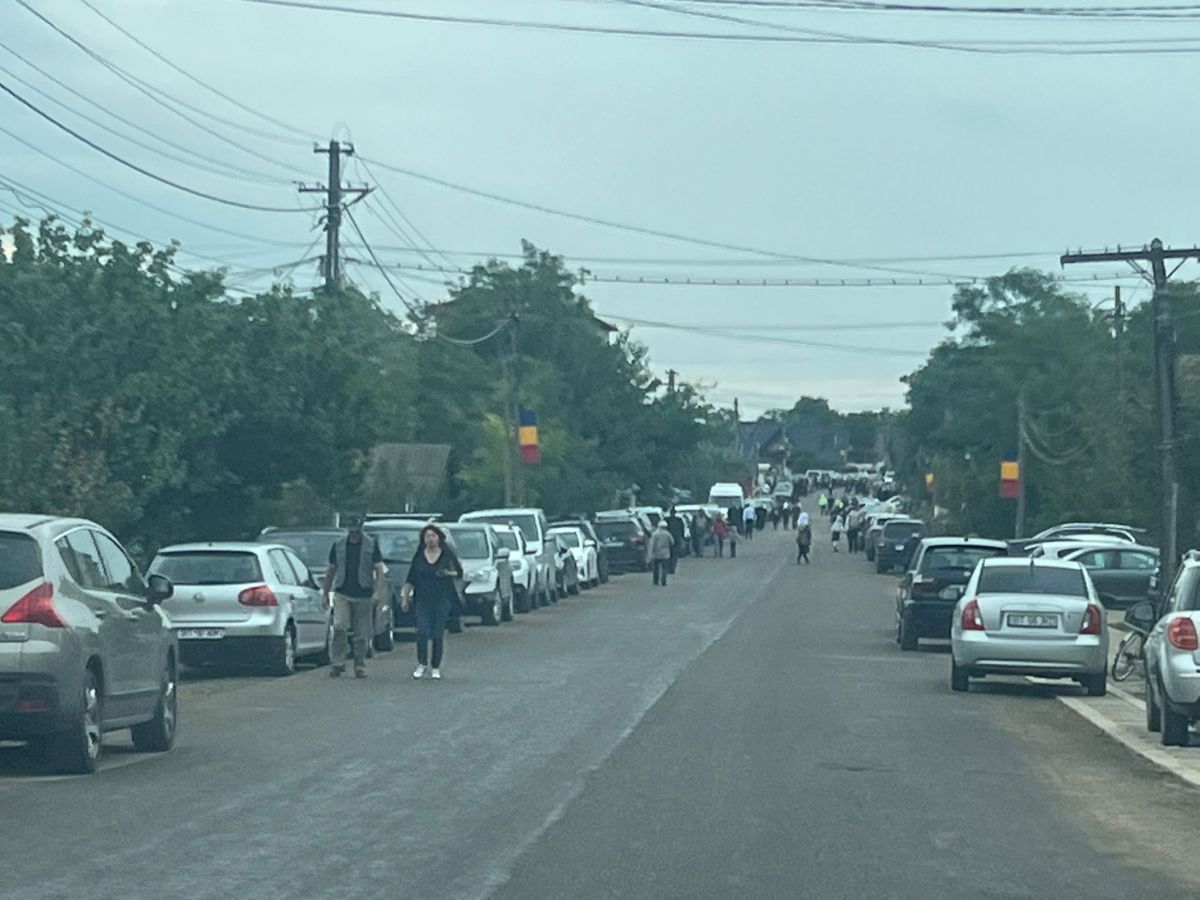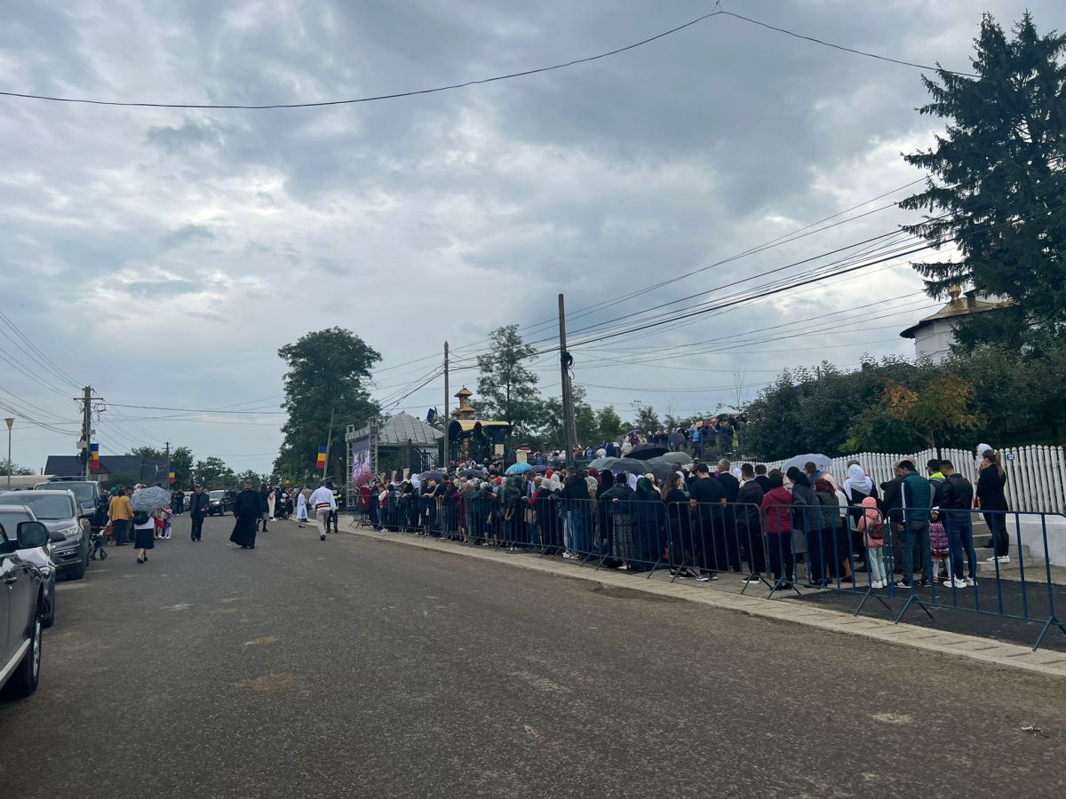 Oamenii au venit cu umbrele, pentru că din cer cade o ploaie măruntă. Mulți credincioși poartă straie populare. Slujba de sfințire are loc în afara bisericii, într-un spațiu special pregătit în acest sens. Organizatorii au montat afară și un ecran uriaș pentru ca toată lumea să poată urmări slujba religioasă.