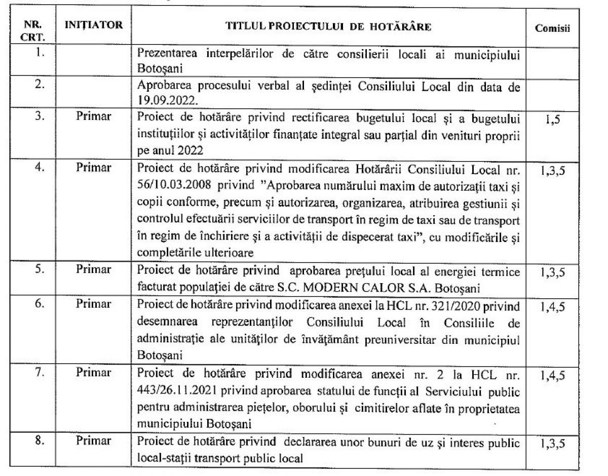 Se convocă, în şedinţă ordinară, Consiliul Local al Municipiului Botoşani, pentru data de 29.09.2022, ora 11:00 în sala de ședințe „Mihai Eminescu” din sediul Primăriei.