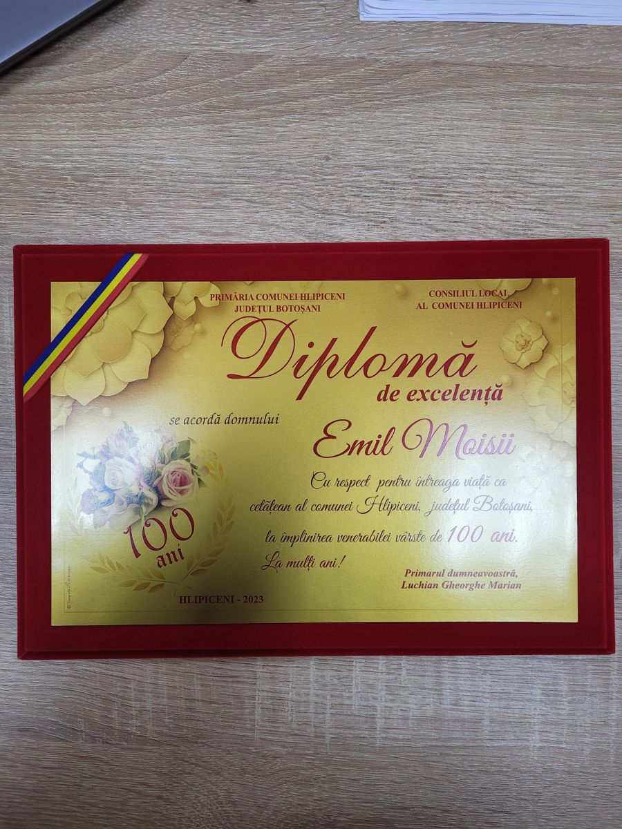 De altfel, Emil Moisii a primit din partea comunității și o Diplomă de excelență, ”cu respect pentru întreaga viață ca cetățean al comunei Hlipiceni, județul Botoșani, la împlinirea venerabilei vârste de 100 de ani”.