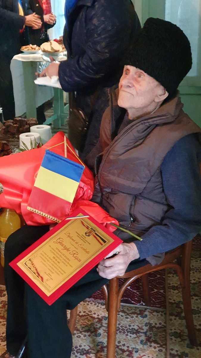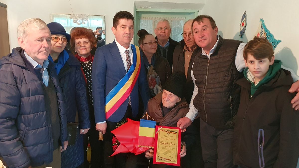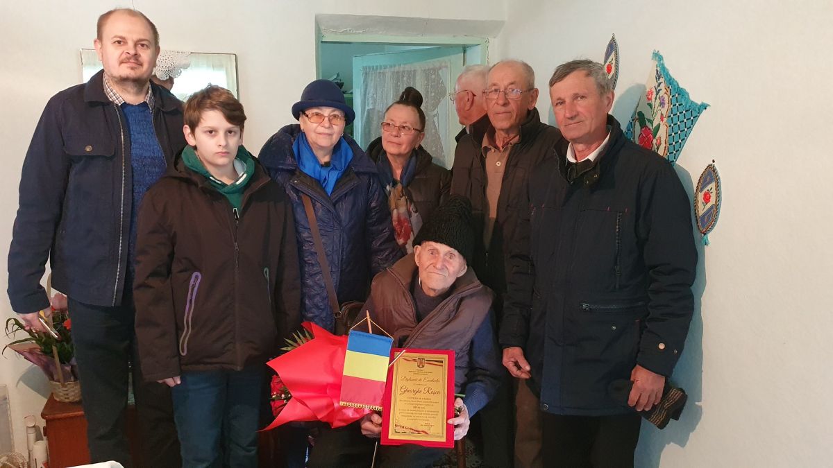 Moș Gheorghe, veteran de război, a primit o Diplomă de Excelență cu prilejul împlinirii vârstei de 100 de ani, ”în semn de aleasă prețuire și recunoștință pentru întreaga sa viață trăită în această comunitate, cu respectarea valorilor și tradițiilor românești”.