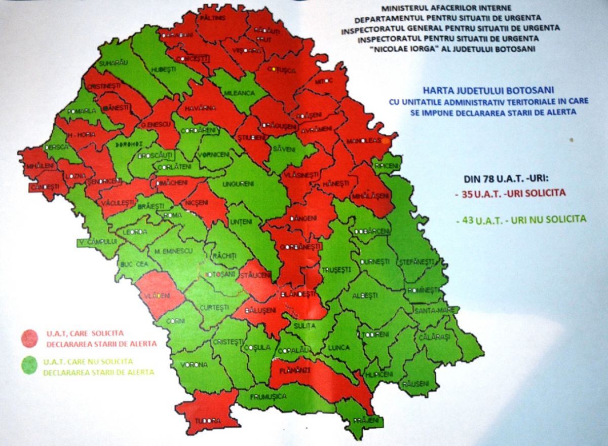 35 de unităţi administrativ-teritoriale intră astfel şi oficial în stare alertă pentru o perioadă de 30 de zile, care se poate extinde sau restrânge, atât ca timp cât şi teritorial, în funcţie de evoluţia fenomenelor meteo. Prin hotărârea CJSU s-au dispus mai multe măsuri, printre care: