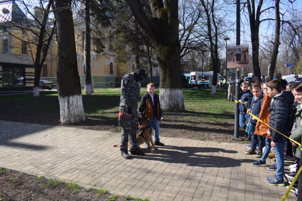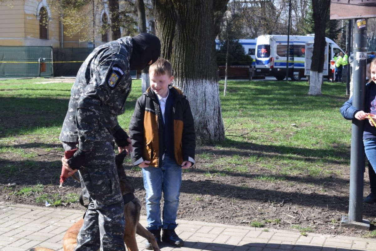 Copiii s-au bucurat de prestația polițistului canin oferită pe spațiul verde, sub coordonarea conductorului său.