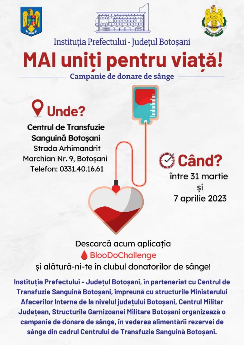 Instituția Prefectului, în parteneriat cu Centrul de Transfuzie Sanguină (CTS) Botoșani, împreună cu structurile Ministerului Afacerilor Interne și Ministerului Apărării Naționale de la nivelul județului, lansează o campanie de donare de sânge.