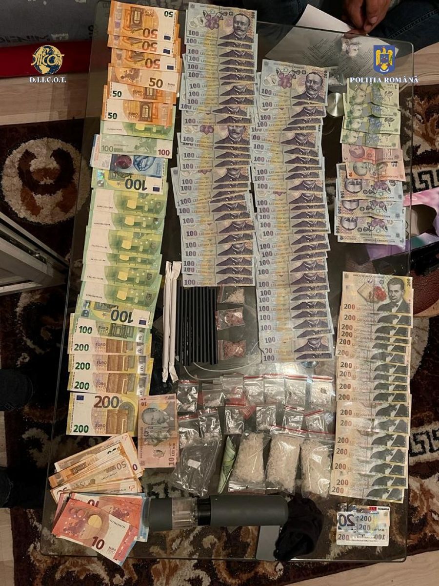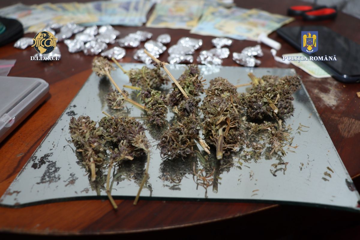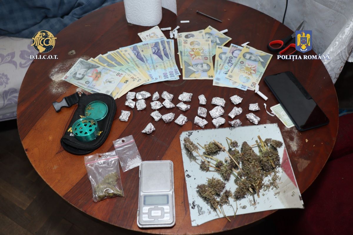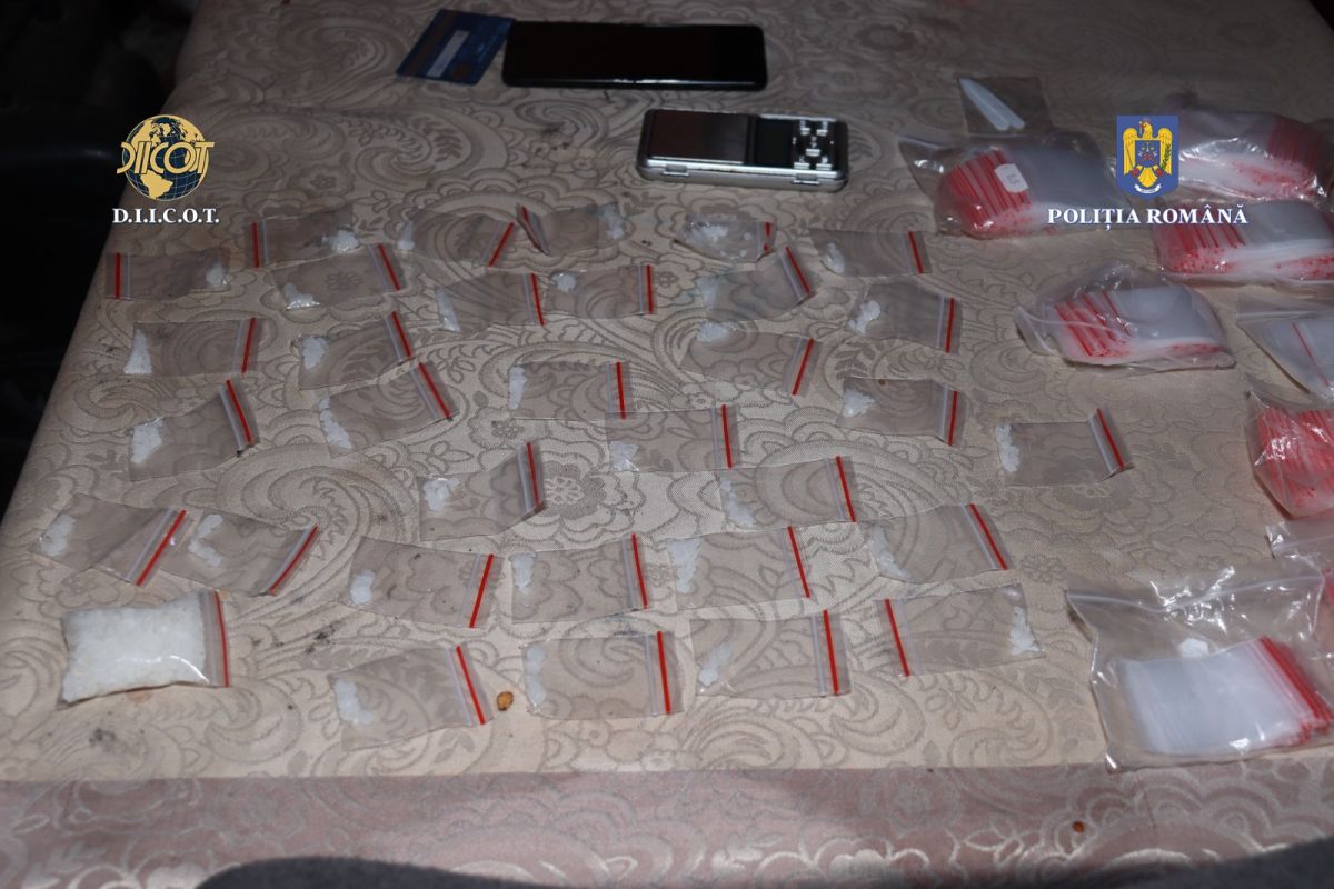 De asemenea, au fost ridicate aproximativ 70 de grame de 3-CMC, 24 de grame de substanță vegetală susceptibilă a fi canabis, 673 de plicuri ziplock nefolosite, 4 cântare de mare precizie, 3 grindere, 33 de telefoane mobile, 2 laptopuri, 9 ceasuri.