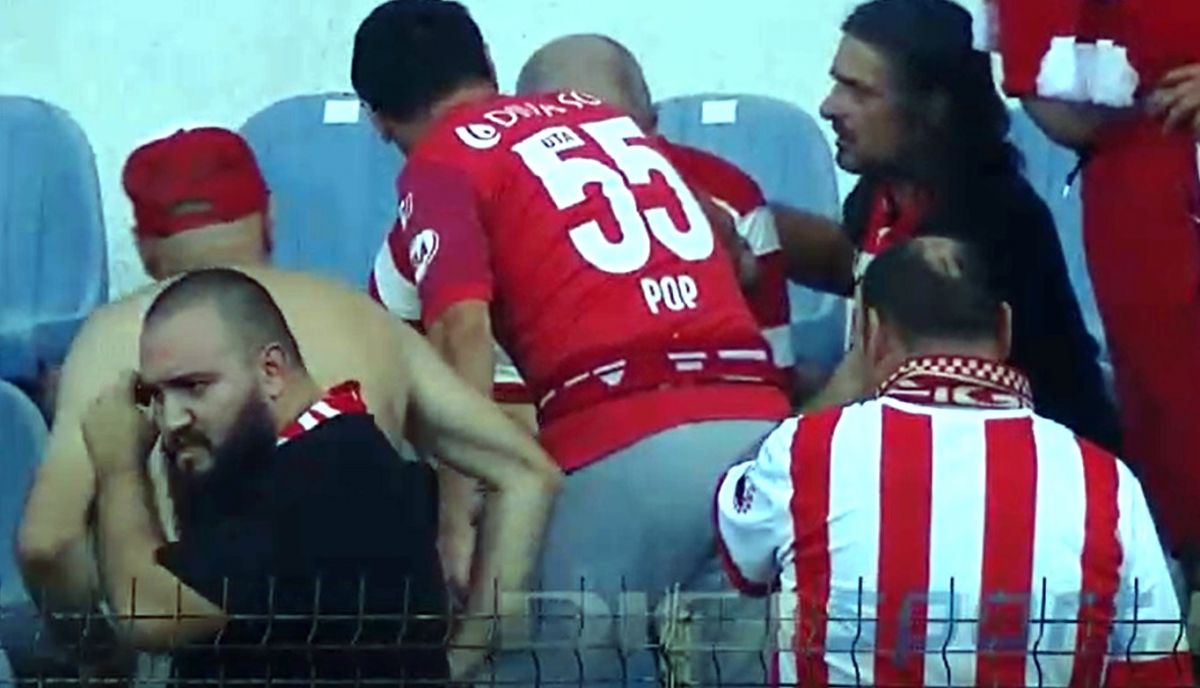Fanul din vestul țării urmărea partida alături de galeria oaspeților în peluza Marian Crudu, iar ceilalți ultrași au făcut semn către brigada de arbitri să oprească jocul pentru a i se oferi îngrijiri.