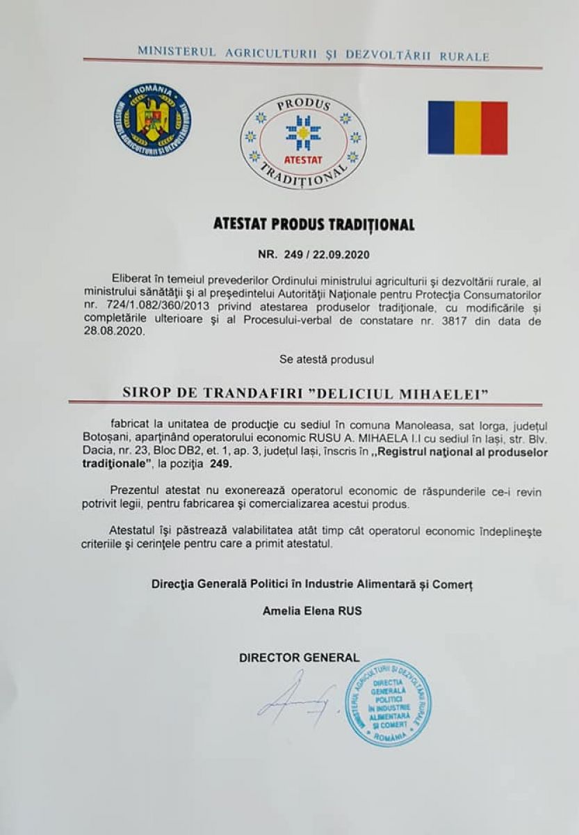 Săptămâna trecută, la Botoşani, au fost atestate cele mai noi produse tradiţionale. Este vorba despre oţetul de trandafir şi sirop de trandafiri marca „Deliciul Mihaelei“, produse de Mihaela Rusu, o femeie-fermier de pe malurile Prutului.