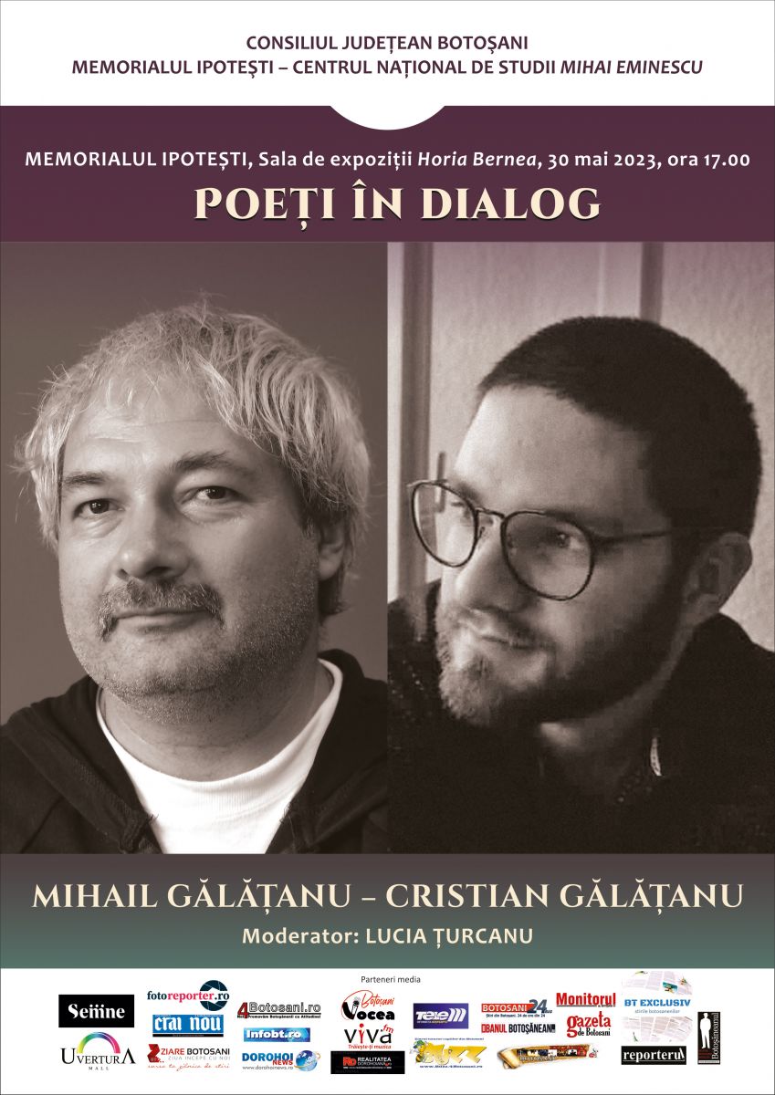 Memorialul Ipotești – Centrul Național de Studii „Mihai Eminescu”, instituție din subordinea Consiliului Județean Botoșani, organizează, marți, 30 mai 2023, ora 17.00, o nouă ediție a întâlnirilor Poeți în dialog. Invitații lunii mai sunt Mihail Gălățanu și Cristian Gălățanu.