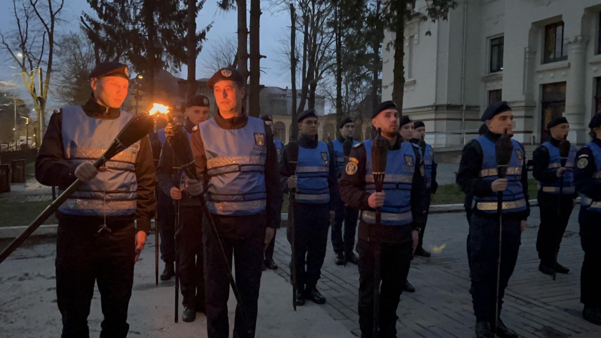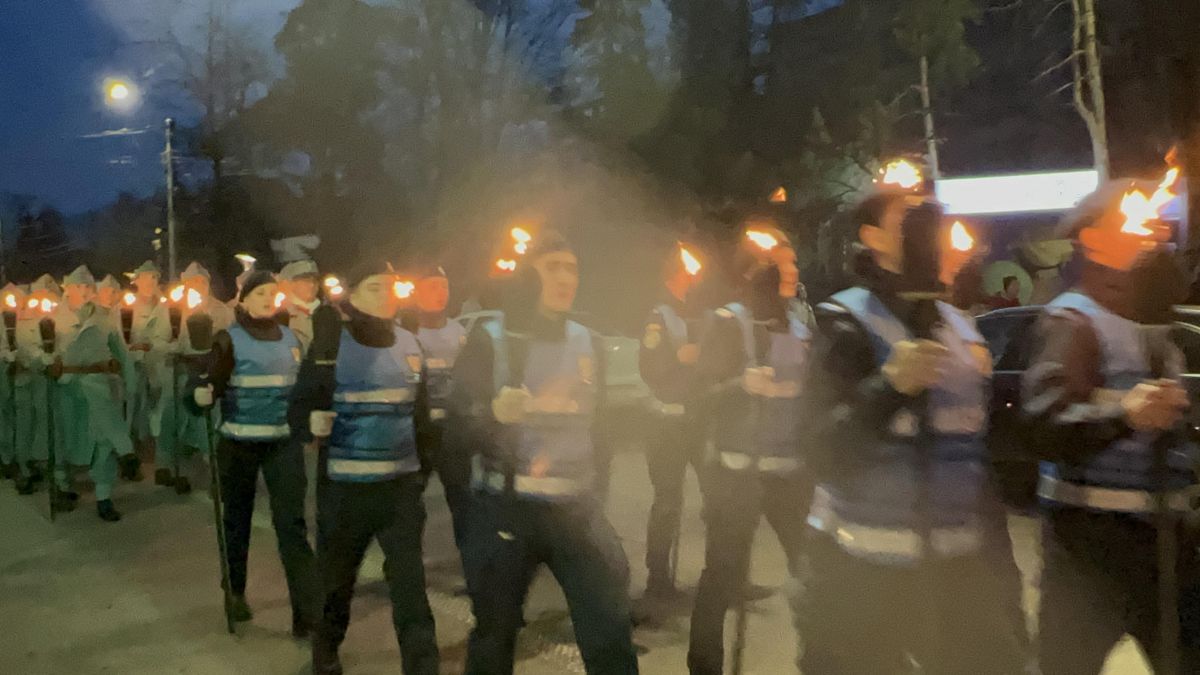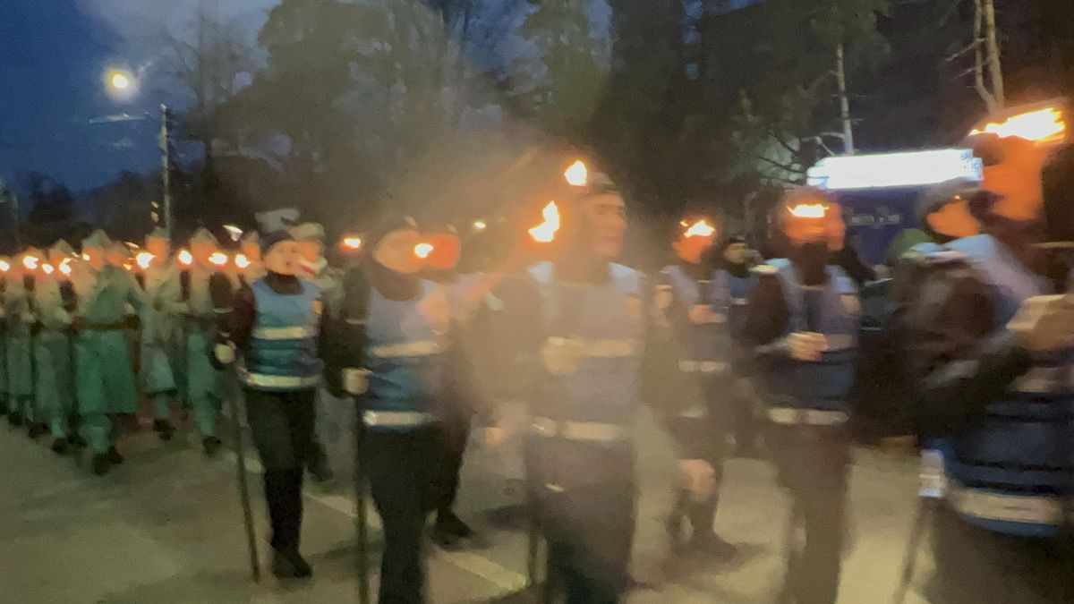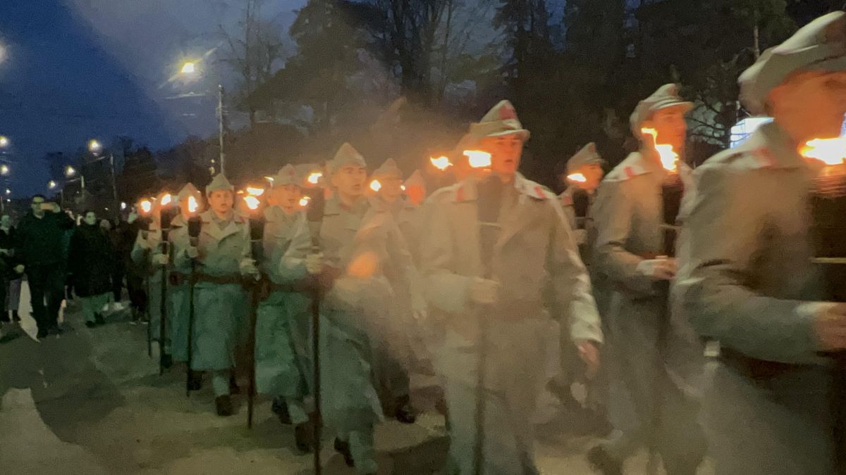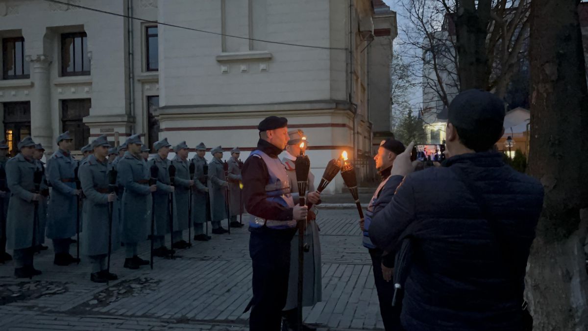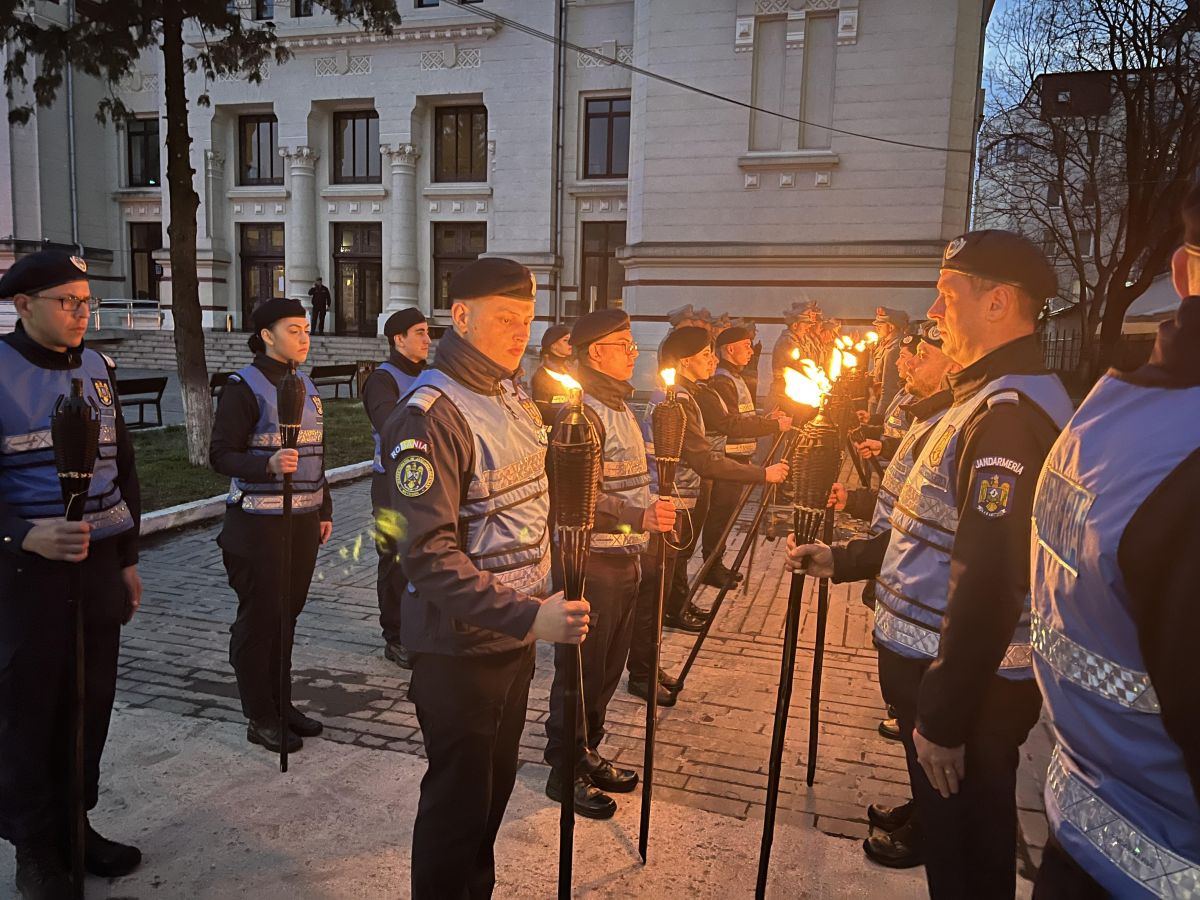 Două plutoane de jandarmi s-au încolonat înainte de ora anunțată având torțele în mâini. Fix la ora 20:00, sub comandă acestea au fost aprinse după care s-a pornit în defilare, vocile jandarmilor împletindu-se în cântece militare de marș.
