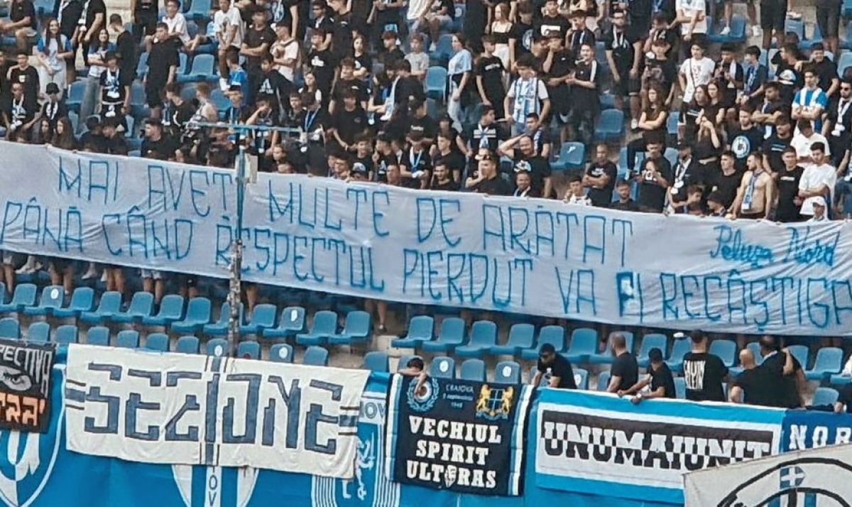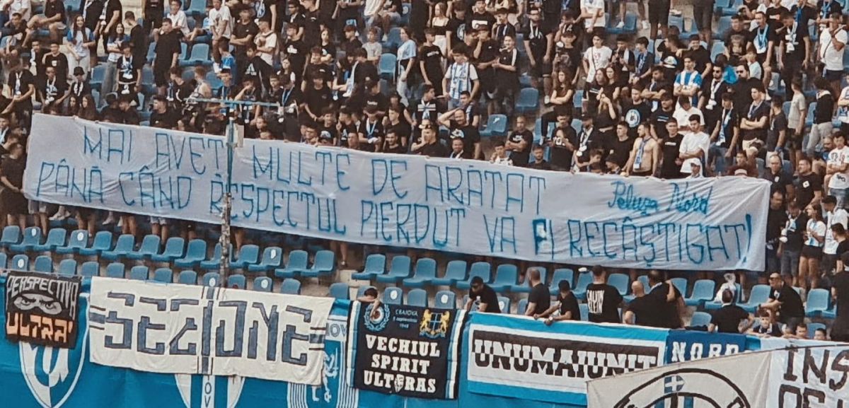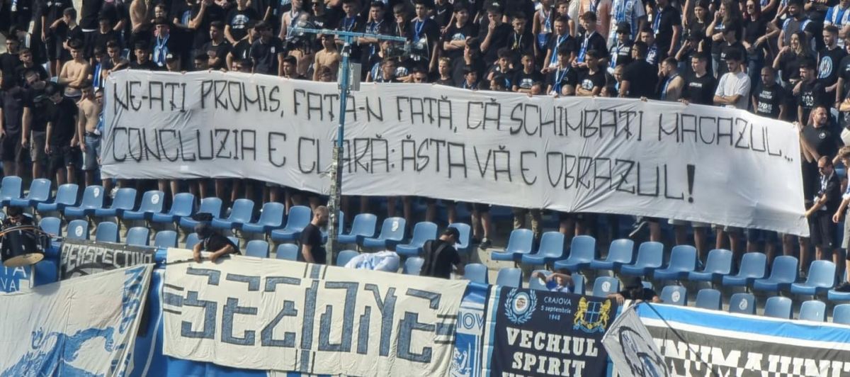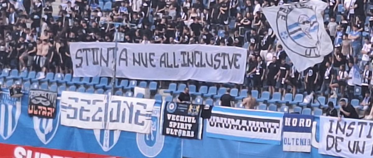 Dincolo de huiduieli, ultrașii olteni au afișat mai multe mesaje dure pe durata partidei. Nimeni din club n-a scăpat de ironiile suporterilor: